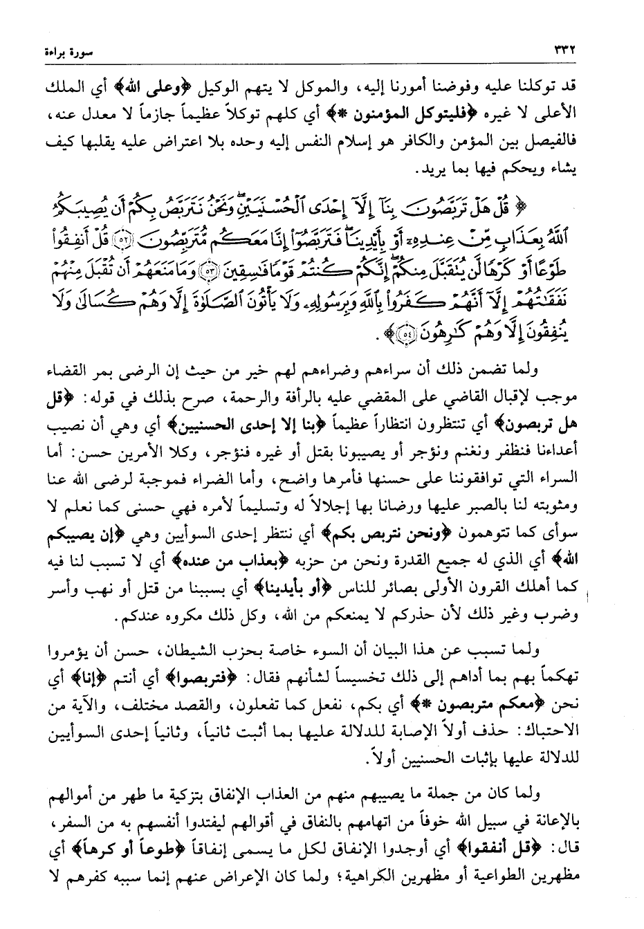 ) قُلْ هَلْ تَرَبَّصُونَ بِنَآ إِلاَّ إِحْدَى الْحُسْنَيَيْنِ وَنَحْنُ نَتَرَبَّصُ بِكُمْ أَن يُصِيبَكُمُ اللَّهُ بِعَذَابٍ مِّنْ عِندِهِ أَوْ بِأَيْدِينَا فَتَرَبَّصُواْ إِنَّا مَعَكُمْ مُّتَرَبِّصُونَ قُلْ أَنفِقُواْ طَوْعاً أَوْ كَرْهاً لَّن يُتَقَبَّلَ مِنكُمْ إِنَّكُمْ كُنتُمْ قَوْماً فَاسِقِينَ وَمَا مَنَعَهُمْ أَن تُقْبَلَ مِنْهُمْ نَفَقَاتُهُمْ إِلاَّ أَنَّهُمْ كَفَرُواْ بِاللَّهِ وَبِرَسُولِهِ وَلاَ يَأْتُونَ الصَّلاَةَ إِلاَّ وَهُمْ كُسَالَى وَلاَ يُنفِقُونَ إِلاَّ وَهُمْ كَارِهُونَ ( ( )