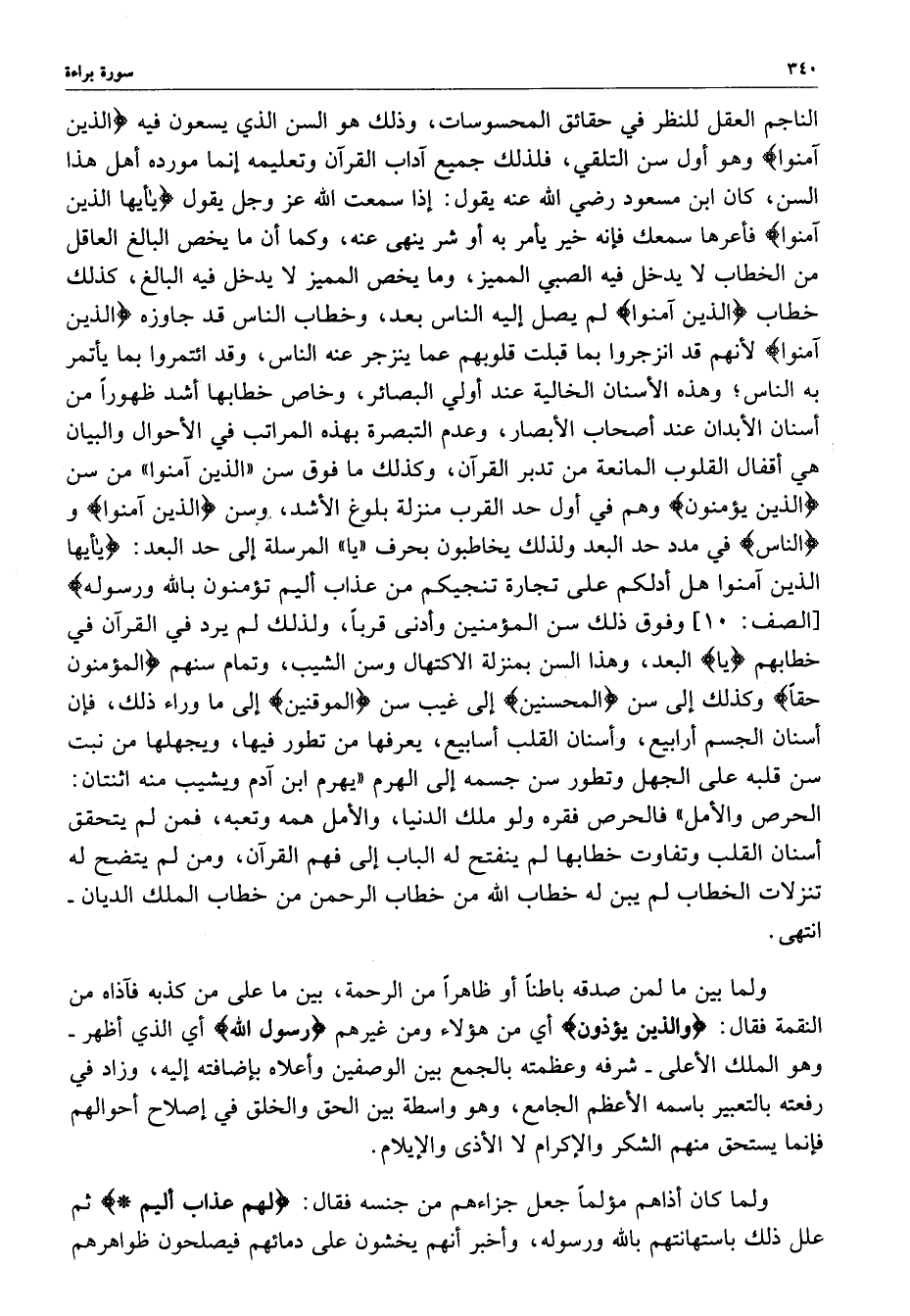 الناجم العقل للنظر في حقائق المحسوسات ، وذلك هو السن الذي يسعون فيه ) الذينآمنوا ( وهوأول سن التلقي ، فلذلك جميع آداب القرىن وتعليمه إنما مورده أهل هذا السن ، كان ابن مسعود رضي الله عنه يقول : إذا سمعت الله عزل وجل يقول ) يأيها الذين آمنوا ( فأعرها سمعك فإنه خير يأمر به أو شر ينهي عنه ، وكما ان ما يخص البالغ ، كذلك خطاب ) الذين آمنوا ( لم يصل إليه الناس بعد ، وخطاب الناس قد جاوزه ) الذين آمنوا ( لأنهم قد انزجروا بما قبلت قلوبهم عما ينزجر عنه الناس ، وقد ائتمروا بما يأتمر به الناس ؛ وهذه الأسنان الخالية عند اولي البصائر ، وخاص خطابها أشد ظهوراً من اسنان الأبدان عند أصحاب الأبصار ، وعدم التبصرة بهذه المراتب في الأحوال والبيان هي أقفال القلوب المانعة من تدبر القرآن ، وكذلك ما فوق سن ( الذين آمنوا ) من سن ) الذين يؤمنون ( وهم في أول حد القرب منزلة بلوغ الأشد ، وسن ) الذين آمنوا ( و ) الناس ( في مدد حد البعد ولذلك يخاطبون بحرف ( يا ) المرسلة إلى حد البعد :