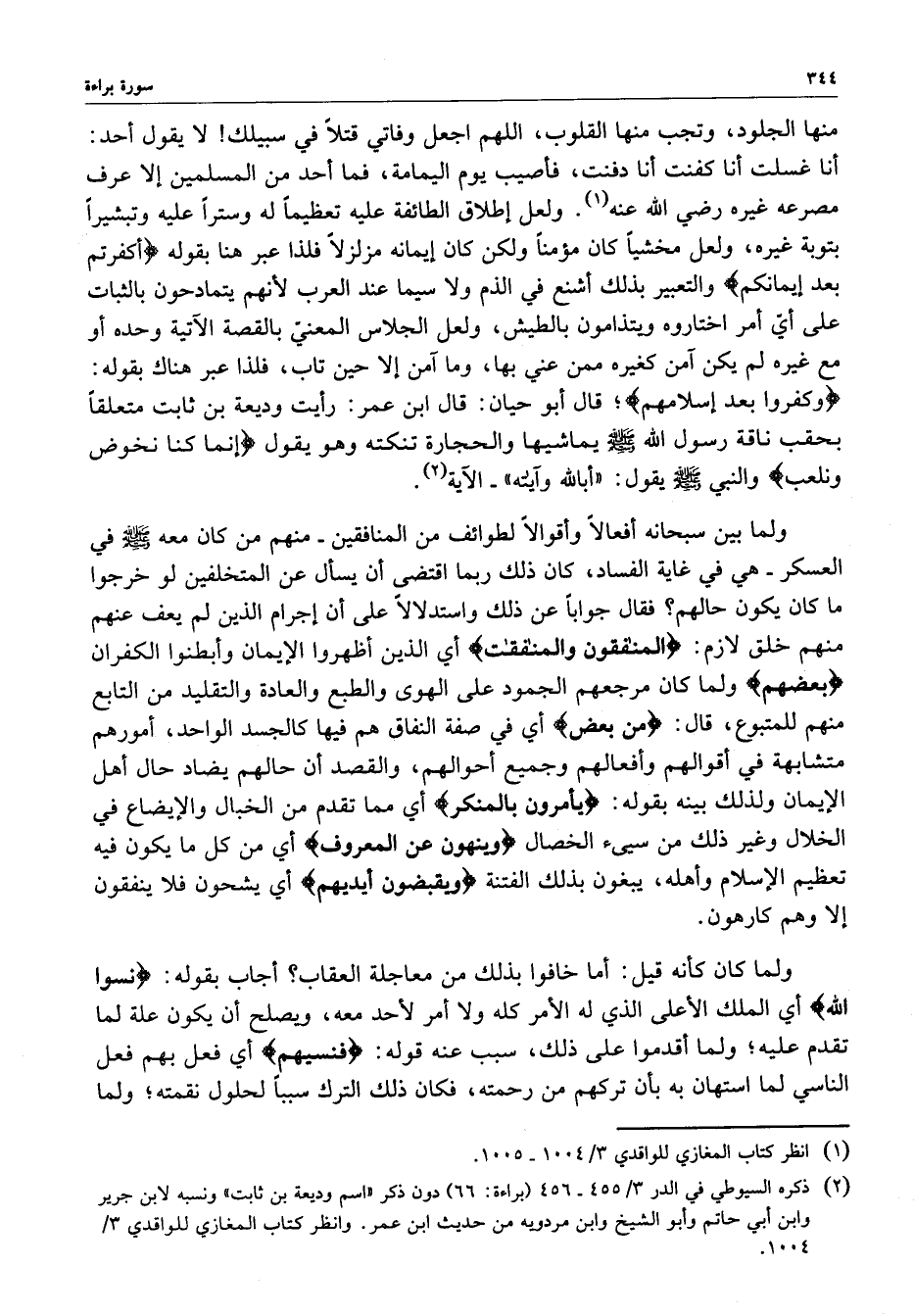 ولعل إطلاقاً الطائفة عليه تعظيماً له وستراً عليه وتبشيراً بتوبة غيره ، ولعل مخشياً كان مؤمناً ولكن كان إيمانه مزلزلاً فلذا عبر هنا بقوله ) أكفرتم بعد إيمانكم ( والتعبير بذلك أشنع في الذم ولا سيما عند العرب لأنهم يتمادحون بالثبات على أيّ أمر اختاروه ويتذامون بالطيش ، ولعل الجلاس المعنيّ بالقصة الآتية وحده أو مع غيره لم يكن آمن كغيره ممن عنى بها ، وما آمن إلا حين تاب ، فلذا عبر هناك بقوله : ( وكفروا بعد إسلامهم ( ؛ قال أبو حيان : قال ابن عمر : رأيت وديعة بن ثابت متعلقاً بحقب ناقة رسول الله ( صلى الله عليه وسلم ) يماشيها والحجارة تنكته وهو يقول ) إنما كنا نخوض ونلعب ( والنبي ( صلى الله عليه وسلم ) يقول : ( أبالله وآياته ) - الآية .