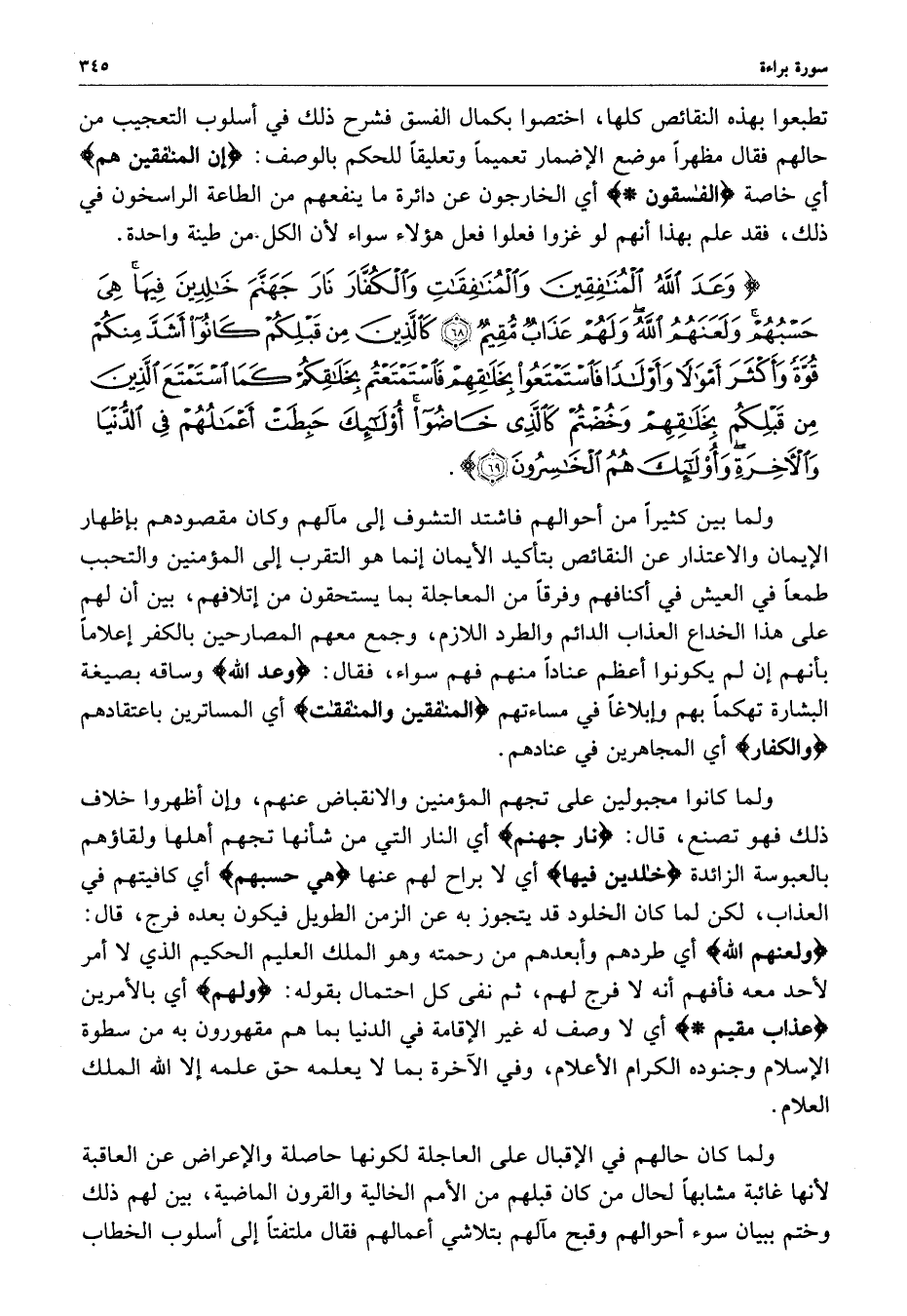 ) وَعَدَ الله الْمُنَافِقِينَ وَالْمُنَافِقَاتِ وَالْكُفَّارَ نَارَ جَهَنَّمَ خَالِدِينَ فِيهَا هِيَ حَسْبُهُمْ وَلَعَنَهُمُ اللَّهُ وَلَهُمْ عَذَابٌ مُّقِيمٌ كَالَّذِينَ مِن قَبْلِكُمْ كَانُواْ أَشَدَّ مِنكُمْ قُوَّةً وَأَكْثَرَ أَمْوَالاً وَأَوْلاَداً فَاسْتَمْتَعُواْ بِخَلاقِهِمْ فَاسْتَمْتَعْتُمْ بِخَلاَقِكُمْ كَمَا اسْتَمْتَعَ الَّذِينَ مِن قَبْلِكُمْ بِخَلاَقِهِمْ وَخُضْتُمْ كَالَّذِي خَاضُواْ أُوْلَئِكَ حَبِطَتْ أَعْمَالُهُمْ فِي الدنْيَا وَالآخِرَةِ وَأُوْلَئِكَ هُمُ الْخَاسِرُونَ ( ( )
