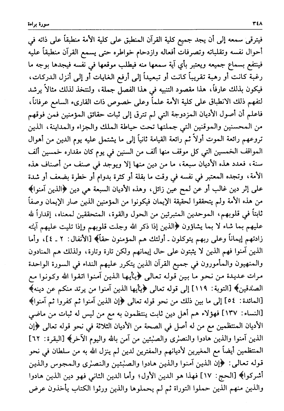 فيرتقي سمعه إلى أن يجد جميع كلية القرآن المنطبق على كلية الأمة منطبقاً على ذاته في احوال نفسه وتقلباته وتصرفاته افعاله وازدحام خواطره حتى يسمع القرآن منطبقاً عليه فينتفع بسماع جميعه ويعتبر بأي آية سمعها منه فيطلب موقعها في نفسه فيجدها بوجه ما رغبة كانت أو رهبة تقريباً كانت أو تبعيداً إلى أرفع الغايات أو إلى أنزل الدركات ، فيكون بذلك عارفاً ، هذا مقصود التنبيه في هذا الفصل جملة ، ولنتخذ لذلك مثالاً يرشد لتفهم ذلك الانطباق على كلية الأمة علماً وعلى خصوص ذات القارئ السامع عرفاناً ، فاعلم أن اصول الأديان المزدوجه التي لم تترق غلى ثبات حقائق المؤمنين فمن فوقهم من المحسنين والموقنين التي جملتها تحت حياطة الملك والجزاء والمدانية ، الذين تروعهم رائعة الموت اولاً ثم رائعة القيامة ثانياً حقائق المؤمنين فمن فوقهم المواقف الخمسين التي كل موقف منها ألف من السنين في يوم كان مقداره خمسين ألف سنة ، فعدد هذه الأديان سبعة ، ما من دين منها إلا ويوجد في صنف من أصناف هذه الأمة ، وتجده المعتبر في نفسه في وقت ما بقلة أو كثرة بدوام أو خطرة بضعف أو شدة على إثر دين غالب أو عن لمح عين زائل ، وهذه الأديان السبعة هي دين ) الذين آمنوا ( من هذه الأمة ولم يتحققوا لحقيقة الإيمان فيكونوا من المؤمنين الذين صار الإيمان وصفاً ثابتاً في قلوبهم ، الموحدين المتبرئين من الحول والقوة ، المتحققين لمعناه ، إقداراً لله عليهم بما شاء لا بما يشاؤون