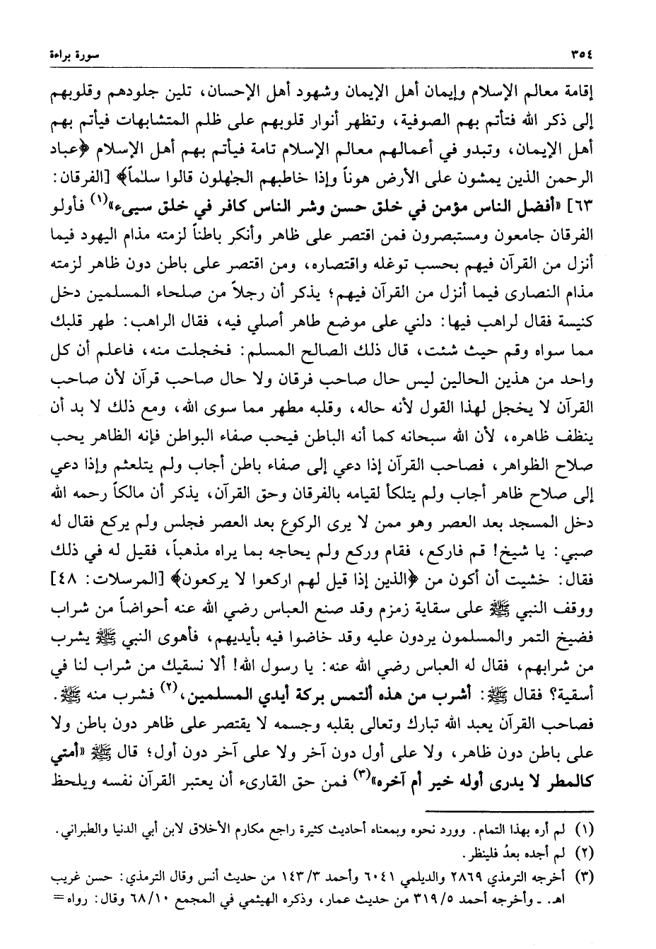 [ الفرقان : 63 ] ( أفضل الناس مؤمن في خلق حسن وشر الناس كافر في خلق سيء ) فأولو الفرقان جامعون ومستبصرون فمن اقتصر على ظاهر وأنكر باطناً لزمته مذام اليهود فيما أنزل من القرآن فيهم بحسب توغله واقتصاره ، ومن اقتصر على باطن دون ظاهر لزمته مذام النصارى فيما أنزل من القرآن فيهم ؛ يذكر أن رجلاً من صلحاء المسلمين دخل كنيسة فقال لراهبفيها : دلني على موضع طاهر اصلي فيه ، فقال الراهب : طهر قلبك مما سواه وقم حيث شئت ، قال ذلك الصالح المسلم : فخجلت منه ، فالعلم ان كل واحد من هذين الحالين ليس حال صاحب فرقان ولا حال صاحب قرآن لأن صاحب القرآن لا يخجل لهذا القول لأنه حاله ، وقلبه مطهر مما سوى الله ، ومع ذلك لابد أن ينظف ظاهره ، لأن الله سبحانه كما أنه الباطن فيجب صفاء باطن اجاب ولم يتعلثم وغذا دعي إلى صلاح ظاهر اجاب ولم يتلكأ لقيامه بالفرقان وحق القرآن ، يذكر أم ملكاً رحمه الله دخل المسجد بعد العصر وهو ممن لا يرى اركوع ولم يحاجه بما يراه مذهباً ، فقيل له في ذلك فقال : خشيت أن أكون من