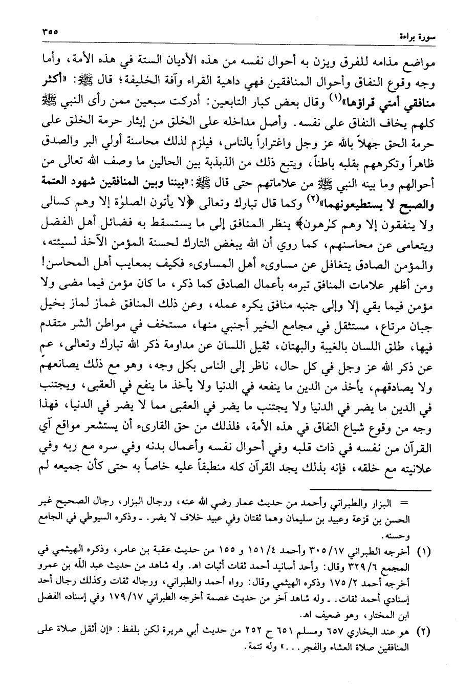 وأصل مداخله على الخلق من إيثار حرمة الخلق على حرمة الحق جهلاً بالله عز وجل واغتراراً بالناي ، فليزم لذلك محاسنة أولى البر والصدق ظاهراً وتكرههم بقلبه باطناً ، ويتبع ذلك من الذبذبة بين الحالين ما وصف الله تعالى من احوالهم وما بينه النبي ( صلى الله عليه وسلم ) من علاماتهم حتى قال ( صلى الله عليه وسلم ) : ( بيننا وبين المنافقين شهود العتمة والصبح لا يستطيعونهما ) وكما قال تبارك وتعالى ) لا يأتون الصلاة إلا وهم كسالى ولا ينفقون إلا وهم كارهون ( ينظر المنافق غلى ما يستسقط يه فضائل أهل الفضل ويتعامى عن محاسنهم ، كما روي أن الله يبغض التارك لحسنه المؤمن الآخذ لسيئته ، والمؤمن فيما بقي إلا وإلى جنبه منافق يكره عمله ، وعن ذلك المنافق غماز لماز بخيل جبان مرتاع ، مستثقل في مجامع الخير أجنبي منها ، مستخف في مواطن الشر متقدم فيها ، طلق اللسان بالغيبة والبهتان ، ثقيل اللسان عن مداومة ذكر الله تبارك وتعالى ، عم عن ذكر الله عز وجل في كل حال ، ناظر إلى الناس بكل وجه ، وهو مع ذلك يصانعهم ولا يصادقهم ، يأخذ م الدين ما ينفعه في الدنيا ولا يأخذ ما ينفع في العقبى ، ويجتنب في الدين ما يضر في الدنيا ولا يجتنب ما يضر ، في في العقبى مما لا يضر في الدنيا ، فهذا وجه من وقوع شياع النفاق في هذه الأمة ، فلذلك من حق القارئ ان يستشعر مواقع آي القرآن من نفسه في ذات قلبه وفي أحوال نفسه وأعمال بدنه وفي سره مع ربه وفي علانبيته مع خلقه ، فإنه بذلك يجد القرآن كله منطبقاً عليه خاصاً به حتى كأن جميعه لم
