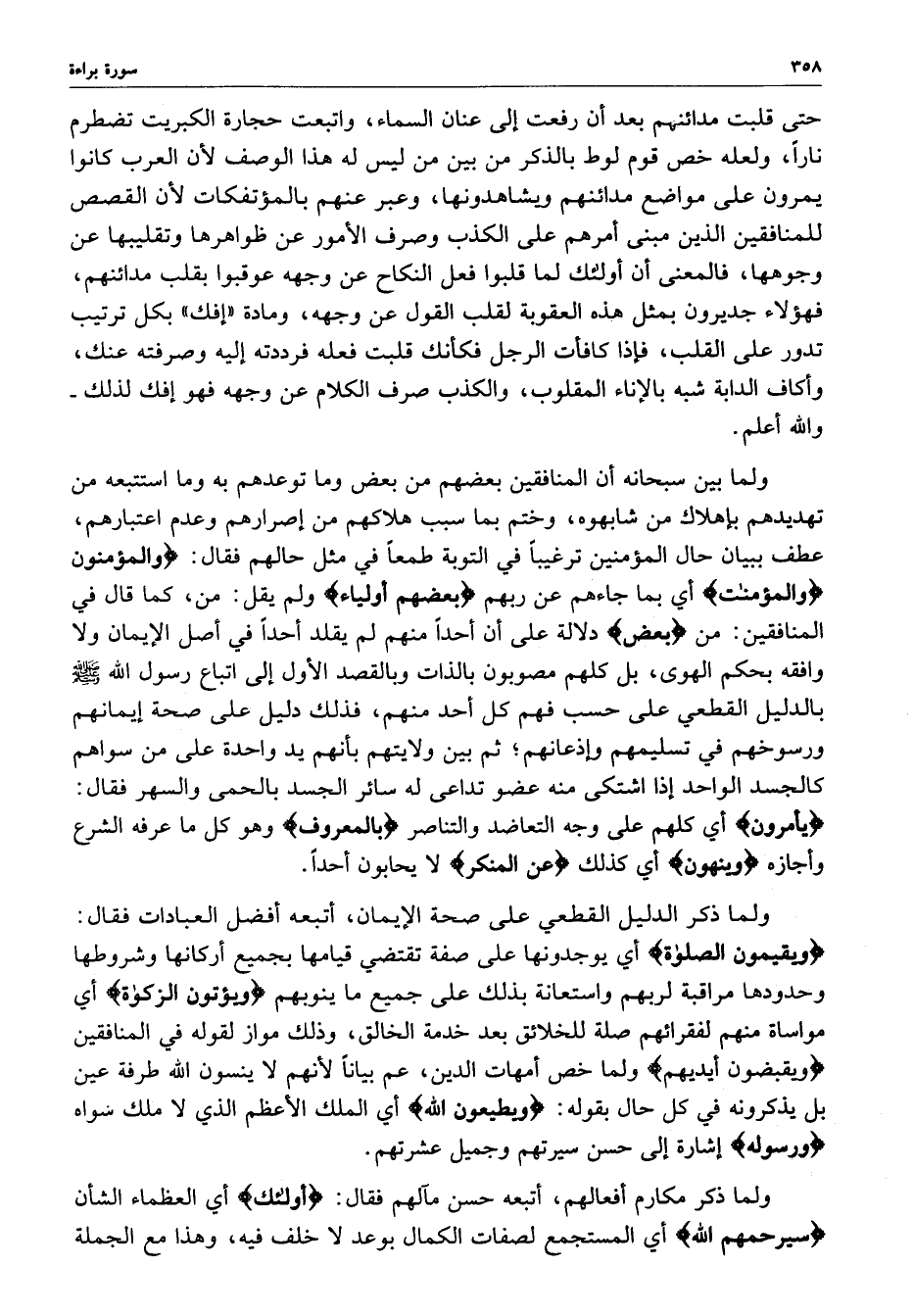 ولما بين سبحانه أن المنافقين بعضهم من بعض وما تواعدهم بعه وما استتبعه من تهديدهم بإهلاك من شابهوه ، وختم بما سبب هلاكهم من إصرارهم وعدم اعتبارهم ، عطف ببيان حال المؤمنين ترغبياً في التوبة طعماً في مثل حالهم فقال : ( والمؤمنون ( ) والمؤمنات ) أي بما جاءهم عن ربهم ) بعضهم اولياء ( ولم يقل : من ، كما قال في المنافقين : من ) بعض ( دلالة على ان أحداً منهم لم يقلد أحداً في أصل الإيمان ولا وافقة بحكم الهوى ، بل كلهم مصوبون بالذات وبالقصد الأول إلى اتباع رسول الله ( صلى الله عليه وسلم ) بالدليل القطعي على حسب فهم كل أحد منهم ، فذلك دليل على صحة إيمانهم ورسوخهم في تسليمهم وإذعانهم ؛ ثم بين ولا يتهم بأنهم يد واحدة على من سواهم كالجسد الواحد إذا اشتكى منه عضو تداعى له سائر الجسد بالحمى والسهر فقال : ( يأمرون ) أي كلهم على وجه التعاضدد والتناصر ) بالمعروف ( وهو كل ما عرفه الشرع وأجازه ) وينهون ) أي كذلك ) عن المنكر ( لا يحابون أحداً .