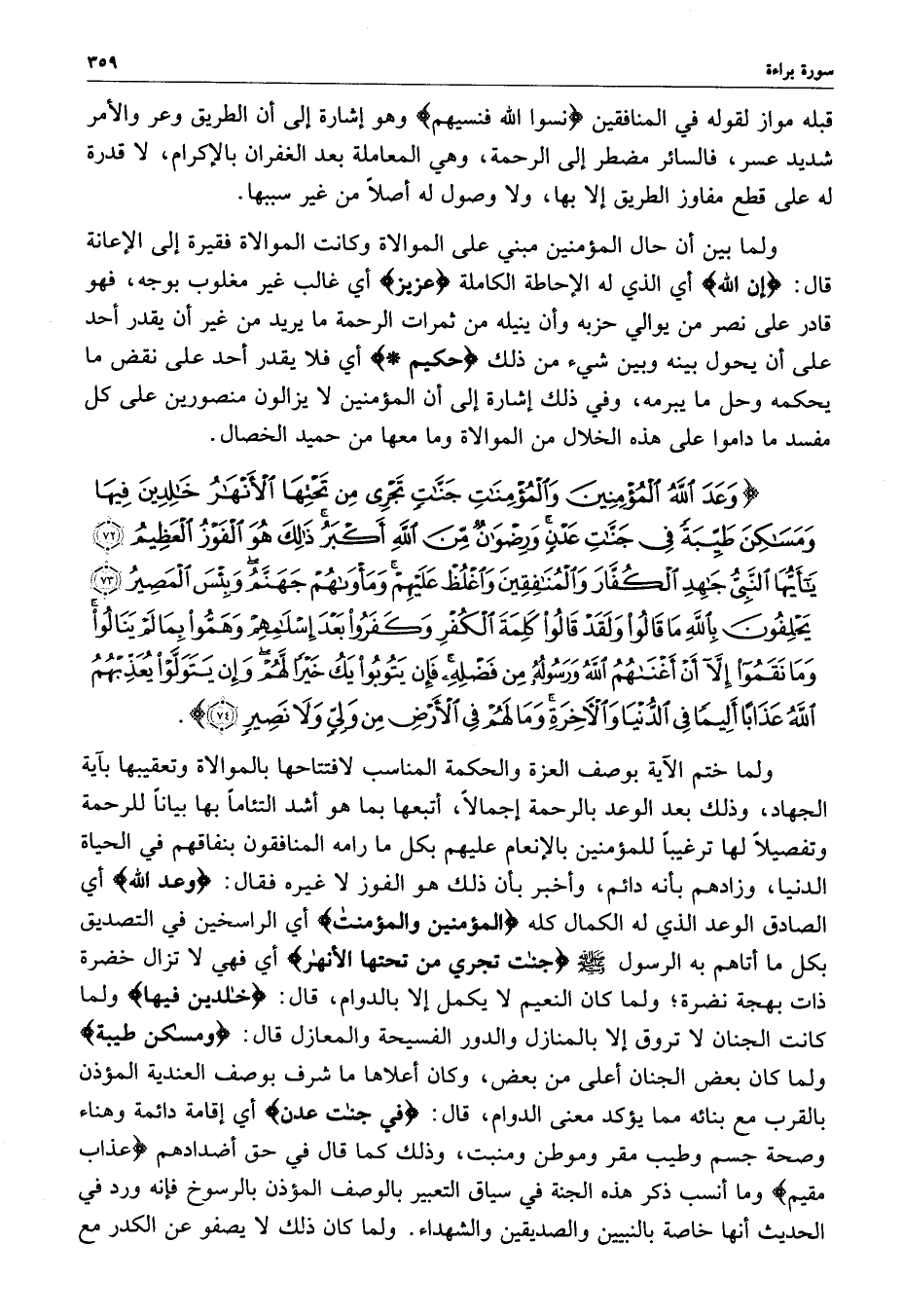 ) وَعَدَ اللَّهُ الْمُؤْمِنِينَ وَالْمُؤْمِنَاتِ جَنَّاتٍ تَجْرِي مِن تَحْتِهَا الأَنْهَارُ خَالِدِينَ فِيهَا وَمَسَاكِنَ طَيِّبَةً فِي جَنَّاتِ عَدْنٍ وَرِضْوَانٌ مِّنَ اللَّهِ أَكْبَرُ ذلِكَ هُوَ الْفَوْزُ الْعَظِيمُ يأَيُّهَا النَّبِيُّ جَاهِدِ الْكُفَّارَ وَالْمُنَافِقِينَ وَاغْلُظْ عَلَيْهِمْ وَمَأْوَاهُمْ جَهَنَّمُ وَبِئْسَ الْمَصِيرُ يَحْلِفُونَ بِاللَّهِ مَا قَالُواْ وَلَقَدْ قَالُواْ كَلِمَةَ الْكُفْرِ وَكَفَرُواْ بَعْدَ إِسْلاَمِهِمْ وَهَمُّواْ بِمَا لَمْ يَنَالُواْ وَمَا نَقَمُواْ إِلاَّ أَنْ أَغْنَاهُمُ اللَّهُ وَرَسُولُهُ مِن فَضْلِهِ فَإِن يَتُوبُواْ يَكُ خَيْراً لَّهُمْ وَإِن يَتَوَلَّوْا يُعَذِّبْهُمُ اللَّهُ عَذَاباً أَلِيماً فِي الدُّنْيَا وَالآخِرَةِ وَمَا لَهُمْ فِي الأَرْضِ مِن وَلِيٍّ وَلاَ نَصِيرٍ ( ( )