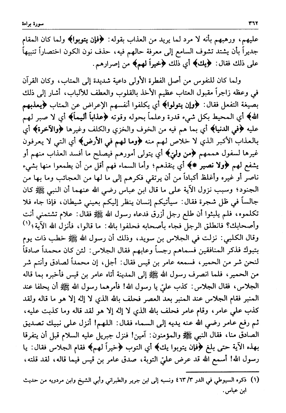 ما قلوا ، فأنزل الله الآية ؛ وقال الكلبي : نزلت في الجلاس بن سويد ، وذلك أن رسول الله ( صلى الله عليه وسلم ) خطب ذات يوم بتبوك فذكر المنافقين فسماهم رجساً وعابهم فقال الجلاس : لئن كان محمداً لصادق وأنتم شر من الحمير ، فلما انصرف رسول الله ( صلى الله عليه وسلم ) إلى المدينة أتاه عامر بن قيس فأخبره بما قاله الجلاس ، فقال الجلاس : كذب عليّ يا رسول الله فأمرهما رسول الله ( صلى الله عليه وسلم ) أن يحلفا عند المنبر فقام الجلاس عند بعد العصر فحلف بالله الذي لا إله إلا هو ما قاله ولقد كذب علي عامر ، وقام عامر فحلف بالله الذي لا إله إلا هو ما قاله ولقد ثم رفع عامر رضي الله عنه يديه إلى السماء فقال : اللهم انزل على نبيك تصديق الصادق منا ، فقال النبي ( صلى الله عليه وسلم ) والمؤمنون آمنين فنزل جبريل عليه السلام قبل أن يتفرقا بهذه الآية حتى بلغ ) فغن تبوبوا يك ( اي التوب ) خيراً لهم ( فقام الجلاس فقال : يا رسول الله اسمع الله قد عرض عليّ التوبة ، صدق عامر بن قيس فيما قاله ، لقد قلته ،