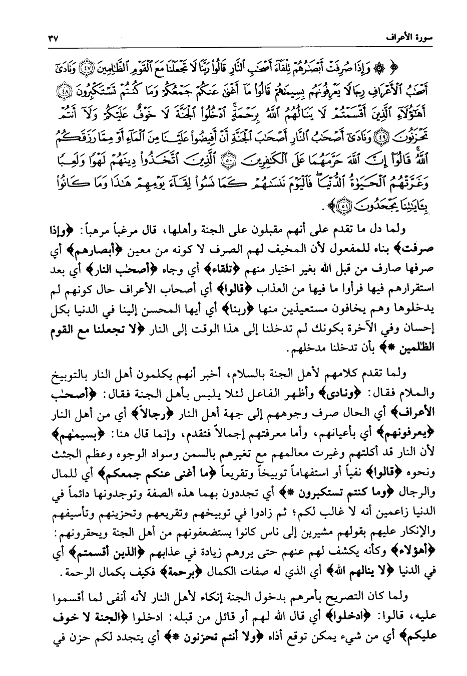 ) وَإِذَا صُرِفَتْ أَبْصَارُهُمْ تِلْقَآءَ أَصْحَابِ النَّارِ قَالُواْ رَبَّنَا لاَ تَجْعَلْنَا مَعَ الْقَوْمِ الظَّالِمِينَ وَنَادَى أَصْحَابُ الأَعْرَافِ رِجَالاٍ يَعْرِفُونَهُمْ بِسِيمَاهُمْ قَالُواْ مَآ أَغْنَى عَنكُمْ جَمْعُكُمْ وَمَا كُنْتُمْ تَسْتَكْبِرُونَ أَهَؤُلاءِ الَّذِينَ أَقْسَمْتُمْ لاَ يَنَالُهُمُ اللَّهُ بِرَحْمَةٍ ادْخُلُواْ الْجَنَّةَ لاَ خَوْفٌ عَلَيْكُمْ وَلاَ أَنتُمْ تَحْزَنُونَ وَنَادَى أَصْحَابُ النَّارِ أَصْحَابَ الْجَنَّةِ أَنْ أَفِيضُواْ عَلَيْنَا مِنَ الْمَآءِ أَوْ مِمَّا رَزَقَكُمُ اللَّهُ قَالُواْ إِنَّ اللَّهَ حَرَّمَهُمَا عَلَى الْكَافِرِينَ الَّذِينَ اتَّخَذُواْ دِينَهُمْ لَهْواً وَلَعِباً وَغَرَّتْهُمُ الْحَيَاةُ الدُّنْيَا فَالْيَوْمَ نَنسَاهُمْ كَمَا نَسُواْ لِقَآءَ يَوْمِهِمْ هَذَا وَمَا كَانُواْ بِآيَاتِنَا يَجْحَدُونَ ( ( )