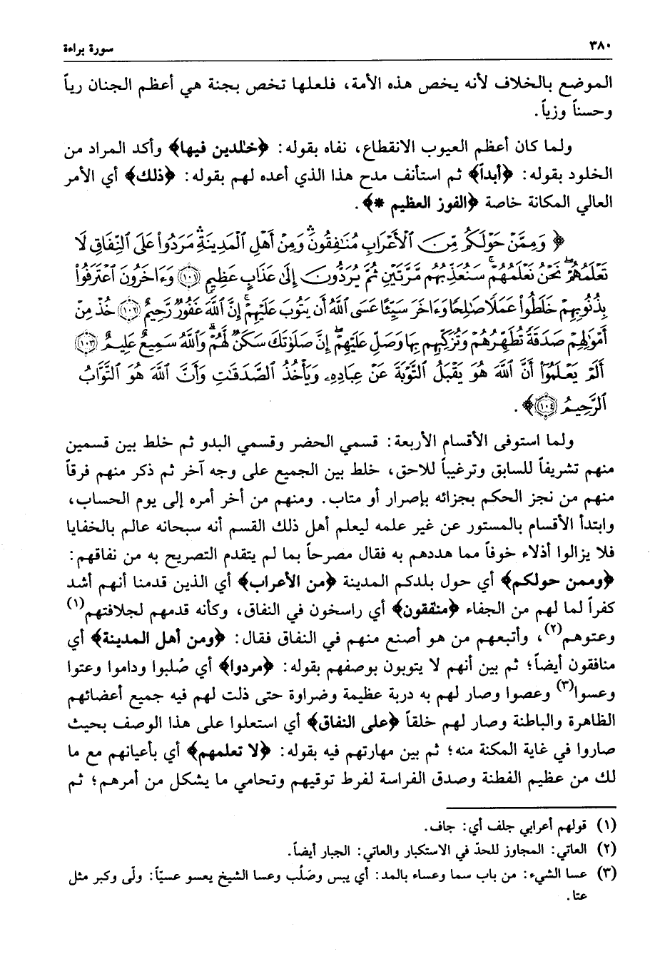 ) وَمِمَّنْ حَوْلَكُمْ مِّنَ الأَعْرَابِ مُنَافِقُونَ وَمِنْ أَهْلِ الْمَدِينَةِ مَرَدُواْ عَلَى النِّفَاقِ لاَ تَعْلَمُهُمْ نَحْنُ نَعْلَمُهُمْ سَنُعَذِّبُهُم مَّرَّتَيْنِ ثُمَّ يُرَدُّونَ إِلَى عَذَابٍ عَظِيمٍ وَآخَرُونَ اعْتَرَفُواْ بِذُنُوبِهِمْ خَلَطُواْ عَمَلاً صَالِحاً وَآخَرَ سَيِّئاً عَسَى اللَّهُ أَن يَتُوبَ عَلَيْهِمْ إِنَّ اللَّهَ غَفُورٌ رَّحِيمٌ خُذْ مِنْ أَمْوَالِهِمْ صَدَقَةً تُطَهِّرُهُمْ وَتُزَكِّيهِمْ بِهَا وَصَلِّ عَلَيْهِمْ إِنَّ صَلَوَاتَكَ سَكَنٌ لَّهُمْ وَاللَّهُ سَمِيعٌ عَلِيمٌ أَلَمْ يَعْلَمُواْ أَنَّ اللَّهَ هُوَ يَقْبَلُ التَّوْبَةَ عَنْ عِبَادِهِ وَيَأْخُذُ الصَّدَقَاتِ وَأَنَّ اللَّهَ هُوَ التَّوَّابُ الرَّحِيمُ ( ( )