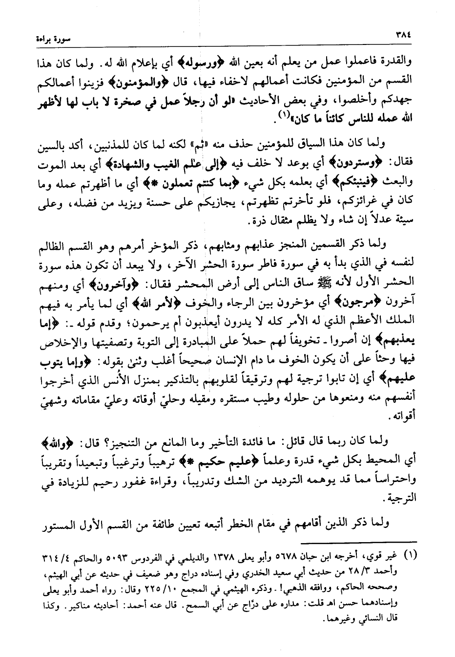 والقدرة فاعلموا عمل من يعلم انه بعين الله ) ورسوله ) أي بإعلام الله له. ولما كان هذا القسم من المؤمنين فكانت اعمالهم لاخفاء فيها ، قال ) المؤمنون ( فزينوا أعمالكم جهدكم وأخلصوا ، وفي الأحاديث ( لو أن جلاً عمل في صخرة لا باب لها لأظهر الله علمه للناس كائناً ما كان ) .