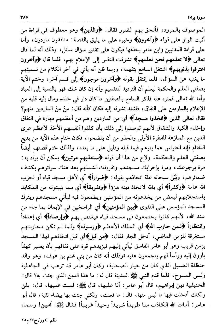 الموصوف بالمرود ، فألحق الضرر فقال : ( والذين ( وهو معطوف في قراءة من أثبت الواو على قوله ) وآخرون ( وخبره على ما يليق بالقصة : منافقون ماردون ، وأما على قراءة المدنيين وابن عامر بحذفها فيكون على تقدير سؤال سائل ، وذلك أنه لما قال تعالى ) لا تعلمهم نحن نعلمهم ( تشوفت النفس إلى الإعلام بهم ، فلما قال ) وآخرون اعترفوا بذنوبهم ( اشتغل السامع بتفهمه ، ورما ظن أنه يأتي في آخر الكلام من تسميتهم ما يغنيه عن السؤال ، فلما إنتقل بقوله ) وىخرون مرجون ( إلى قسم آخر ، وختم الآية بصفتي العلم والحكمة ليعلم ان التردد للتقسيم وأنه كان شك فهو بالنسبة إلى العباد وأما الله نعالى فمنزه عنه فذكر السامع بالصفتين ما كان دار في خلده ومال إليه قلبه من الإعلام بالماردين على النفاق ، فاشتد تشوفه غليه فكان كأنه قال : منٍْ منَ الماردين منهم ؟ فقال تعالى الذين ) اتخذوا مسجداً ) أي من الماردين وهم من اعظمهم مهارة في النفاق وإخفاء الكيد والشقاق لأنهم توصلوا إلى ذلك بأن كلفوا أنفسهم الأخذ لأعظم عرى الدين مع المنازعة للفطرة الأولى والحذر من أن يفضحوا ، فكان ختام هذه الآية من بديع الختام فإن احتراس عما يتوهم فيما قلبه ودليل على ما بعده ، ولذلك ختم قصتهم أيضاً بصفتي العلم والحكمة ، ولاح من هذا أن قوله ) سنعذبهم مرتين ( يمكن أن يراد به : مرة برجوعك ، ومرة بإخرابك مسجدهم وتفريقك لشملهم بعد هتك سرائرهم بكشف ضمائرهم ، وبَيَّنَ سبحانه علة اتخاذهم بقوله : ( ضراراً ) أي لأهل مسجد قباء أو لحزب الله عامة ) وكفراً ) أي بالله لاتخاذ دينه هزؤاً ) وتفريقاً ( اي ماما يبيتونه من المكايد باستجلابهم لبعض من يخدعونه من المؤمنين ويطعمون فيه ليأتي مسجدهم ويترك المسجد المؤسس على التقوى ) بين المؤمنين ( اي الراسخين في الإيمان بما جاء من عند الله ، لأنهم كانوا يجتمعون في مسجد قباء فيغتص بهم ) وإرصاداً ) أي إعداداً وانتظاراً ) لمن حاب الله ( اي الملك الأعظم ) ورسوله ( ولما لم تكن محاربتهم مستغرقة للزمن الماضي ، أدخل الجار فقال : ( من قبل ) أي قبل اتخاذهم لهذا المسجد بزمن قريب وهو أبو عامر الفاسق ليأتي إليهم فيزيدهم قوة على نفاقهم بأن يصير كهفاً يأوون إليه ورأساً لهم كان من خيار الصحابة ، وكان أبو عامر قد ترهب في الجاهلية ولبس المسوح ، فلما قدم النبي ( صلى الله عليه وسلم ) المدينة قال له : ما هذا الدين الذي جئت به ؟ قال : ( الحنيفية دين إبراهيم ) ، قال : أبو عامر : أنا عليها ، قال ( صلى الله عليه وسلم ) : ( لست عليها ) ، قال : بلى ولكنك ادخلت فيها ماليس منها ، قال : ما فعلت ، ولكني جئت بها بيضاء نقية ، قال أبو عامر : أمات الله الكاذب من طريداً شريداً وحيداً غريباً فقال ( صلى الله عليه وسلم ) : ( آمين ) وسماه