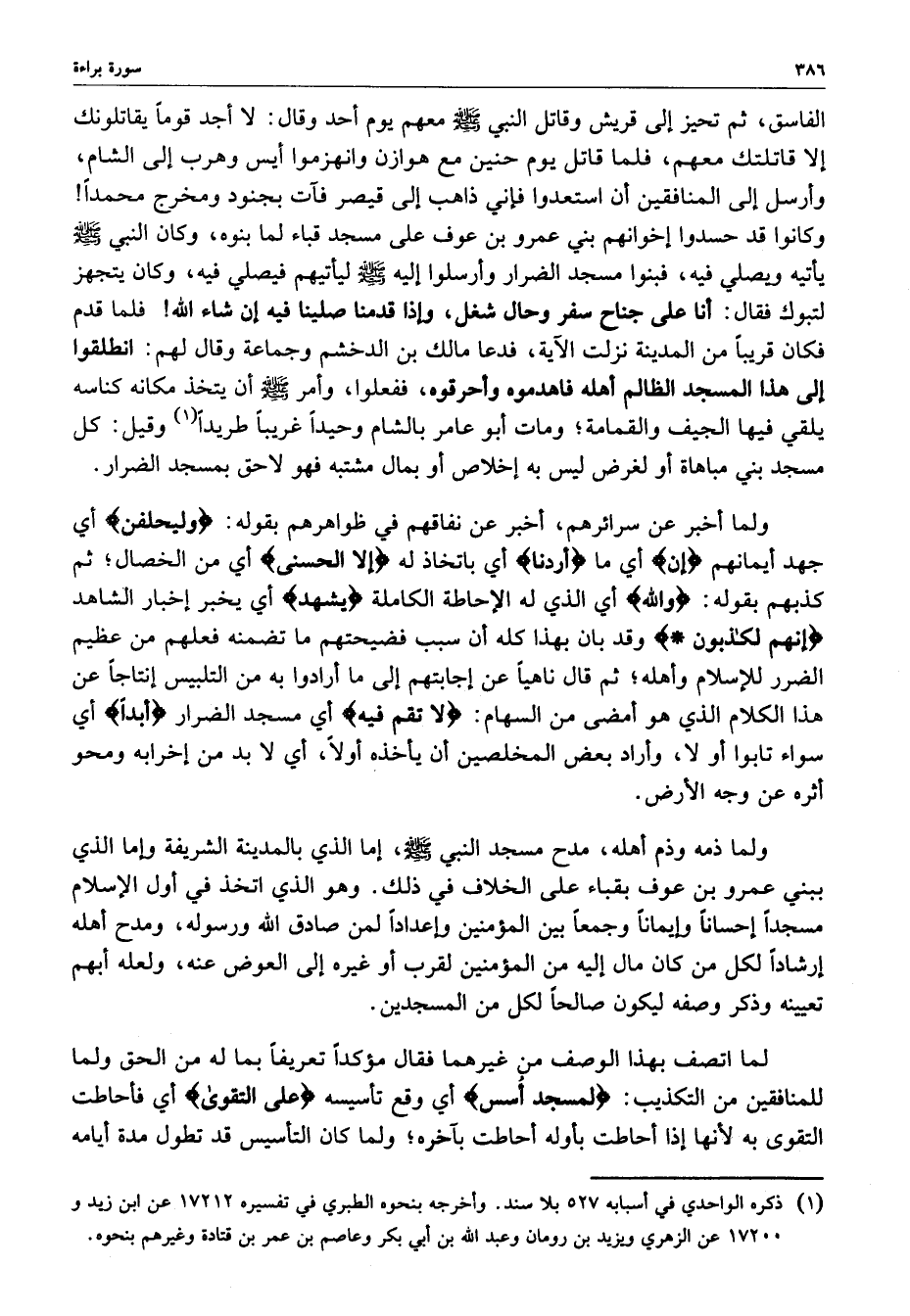 الفاسق ، ثم تحيز إلى قريش وقاتل النبي ( صلى الله عليه وسلم ) معهم يوم أحد وقال : لا أجد قوماً يقاتلونك إلا قاتلتك معهم ، فلما قاتل يوم حنين مع هوازن وانهزموا أيس وهرب إلى الشام ، وأرسل إلى المنافقين أن استعدوا فإني ذاهب إلى قيصر فآت بجنود ومخرج محمداً وكانوا قد حسدوا إخوانهم بني عمرو بن عوف على مسجد قباء لما بنوه ، وكان النبي ( صلى الله عليه وسلم ) يأتيه ويصلي فيه ، فنبوامسجد الضرار وأرسلوا إليه ( صلى الله عليه وسلم ) لياتيهم فيصلي فيه ، وكان يتجهز لنتبوك فقال : ( انا على جناح سفر وحال شغل ، وغذا قدمنا صلينا فيه ان شاء الله ) فلما قدم فكان قريباً من المدينة نزلت الآية ، فدعا مالك بن الدخشم وجماعة وقال لهم : ( انطلقوا إلى هذا المسجد الظالم أهله فاهدموه وأحرقوه ) ففعلوا ، وأمر ( صلى الله عليه وسلم ) ان يتخذ مكانه كناسه يلقي فيها الجيف والقمامه ؛ ومات أبو عامر بالشام وحيداً غريباً طريداً وقيل : كل مسجد بني مباهاة أو الغرض ليس به إخلاص أو بمال مشتبه فهو لاحق بمسجد الضرار .