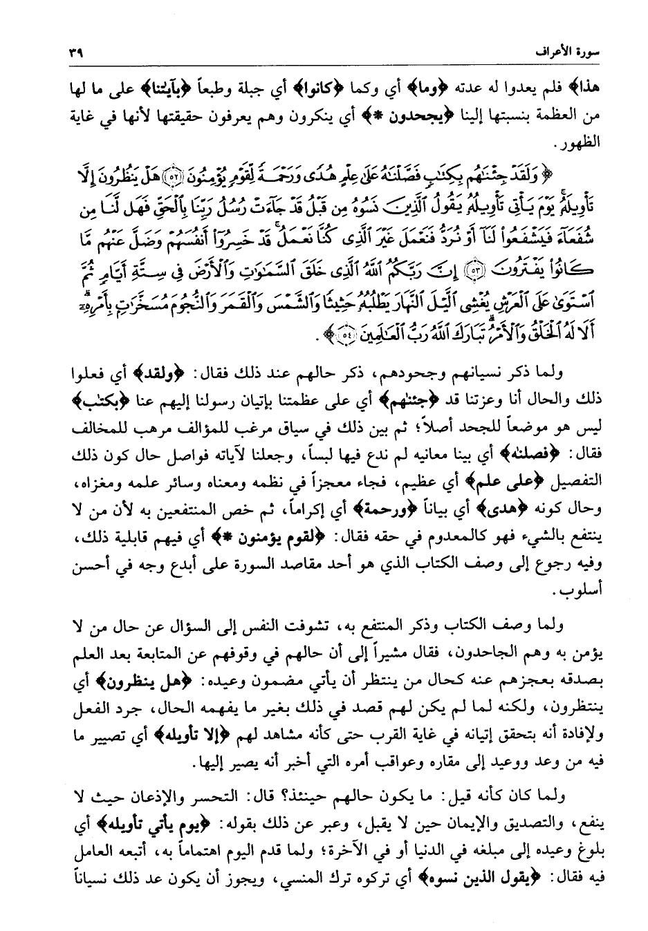 ) وَلَقَدْ جِئْنَاهُمْ بِكِتَابٍ فَصَّلْنَاهُ عَلَى عِلْمٍ هُدًى وَرَحْمَةً لِّقَوْمٍ يُؤْمِنُونَ هَلْ يَنظُرُونَ إِلاَّ تَأْوِيلَهُ يَوْمَ يَأْتِي تَأْوِيلُهُ يَقُولُ الَّذِينَ نَسُوهُ مِن قَبْلُ قَدْ جَآءَتْ رُسُلُ رَبِّنَا بِالْحَقِّ فَهَل لَّنَا مِن شُفَعَآءَ فَيَشْفَعُواْ لَنَآ أَوْ نُرَدُّ فَنَعْمَلَ غَيْرَ الَّذِي كُنَّا نَعْمَلُ قَدْ خَسِرُواْ أَنْفُسَهُمْ وَضَلَّ عَنْهُمْ مَّا كَانُواْ يَفْتَرُونَ إِنَّ رَبَّكُمُ اللَّهُ الَّذِي خَلَقَ السَمَاوَاتِ وَالأَرْضَ فِي سِتَّةِ أَيَّامٍ ثُمَّ اسْتَوَى عَلَى الْعَرْشِ يُغْشِي الْلَّيْلَ النَّهَارَ يَطْلُبُهُ حَثِيثاً وَالشَّمْسَ وَالْقَمَرَ وَالنُّجُومَ مُسَخَّرَاتٍ بِأَمْرِهِ أَلاَ لَهُ الْخَلْقُ وَالأَمْرُ تَبَارَكَ اللَّهُ رَبُّ الْعَالَمِينَ ( ( )