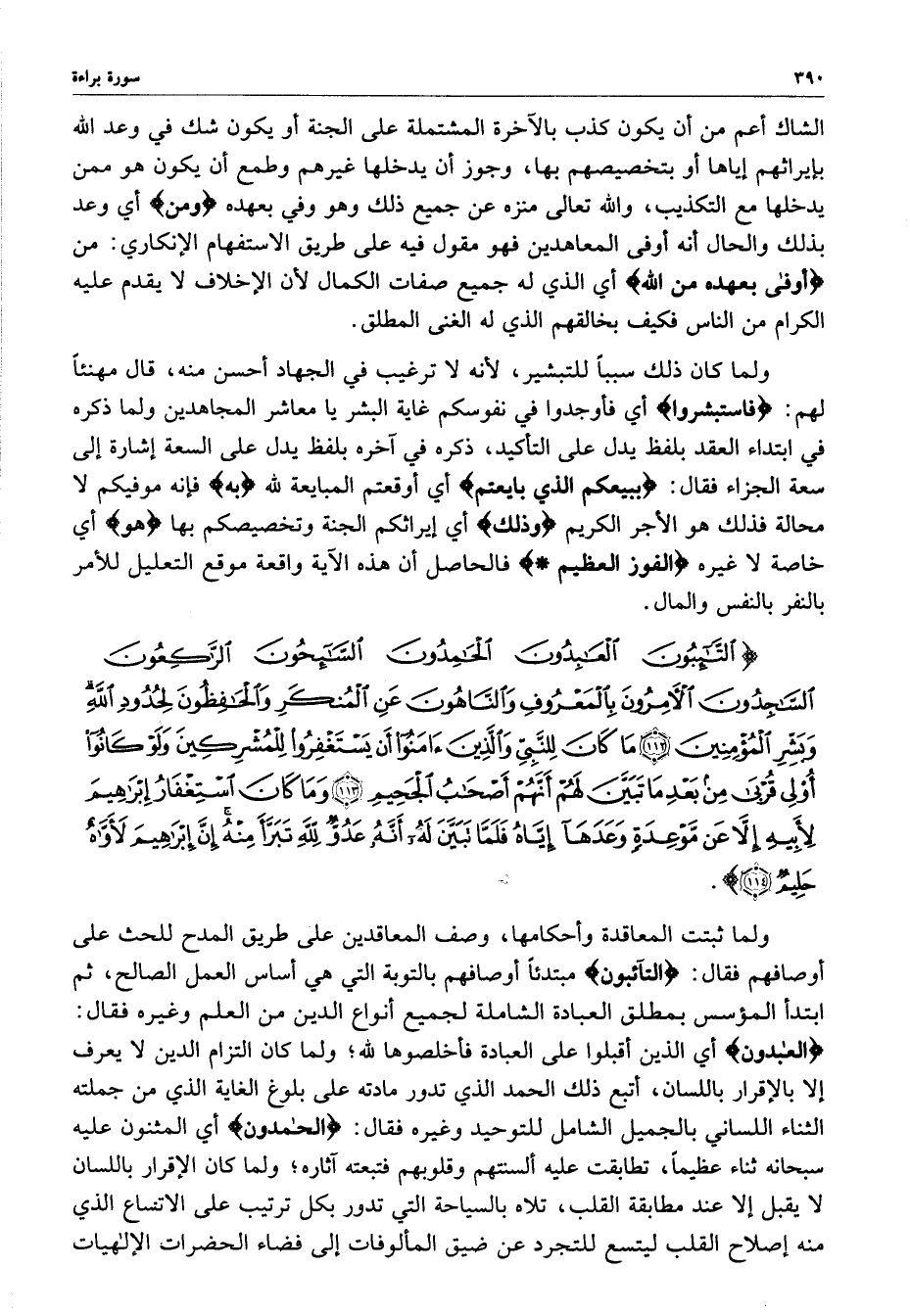 ) التَّائِبُونَ الْعَابِدُونَ الْحَامِدُونَ السَّائِحُونَ الرَّاكِعُونَ السَّاجِدونَ الآمِرُونَ بِالْمَعْرُوفِ وَالنَّاهُونَ عَنِ الْمُنكَرِ وَالْحَافِظُونَ لِحُدُودِ اللَّهِ وَبَشِّرِ الْمُؤْمِنِينَ مَا كَانَ لِلنَّبِيِّ وَالَّذِينَ آمَنُواْ أَن يَسْتَغْفِرُواْ لِلْمُشْرِكِينَ وَلَوْ كَانُواْ أُوْلِي قُرْبَى مِن بَعْدِ مَا تَبَيَّنَ لَهُمْ أَنَّهُمْ أَصْحَابُ الْجَحِيمِ وَمَا كَانَ اسْتِغْفَارُ إِبْرَاهِيمَ لأَبِيهِ إِلاَّ عَن مَّوْعِدَةٍ وَعَدَهَآ إِيَّاهُ فَلَمَّا تَبَيَّنَ لَهُ أَنَّهُ عَدُوٌّ للَّهِ تَبَرَّأَ مِنْهُ إِنَّ إِبْرَاهِيمَ لأَوَّاهٌ حَلِيمٌ ( ( )