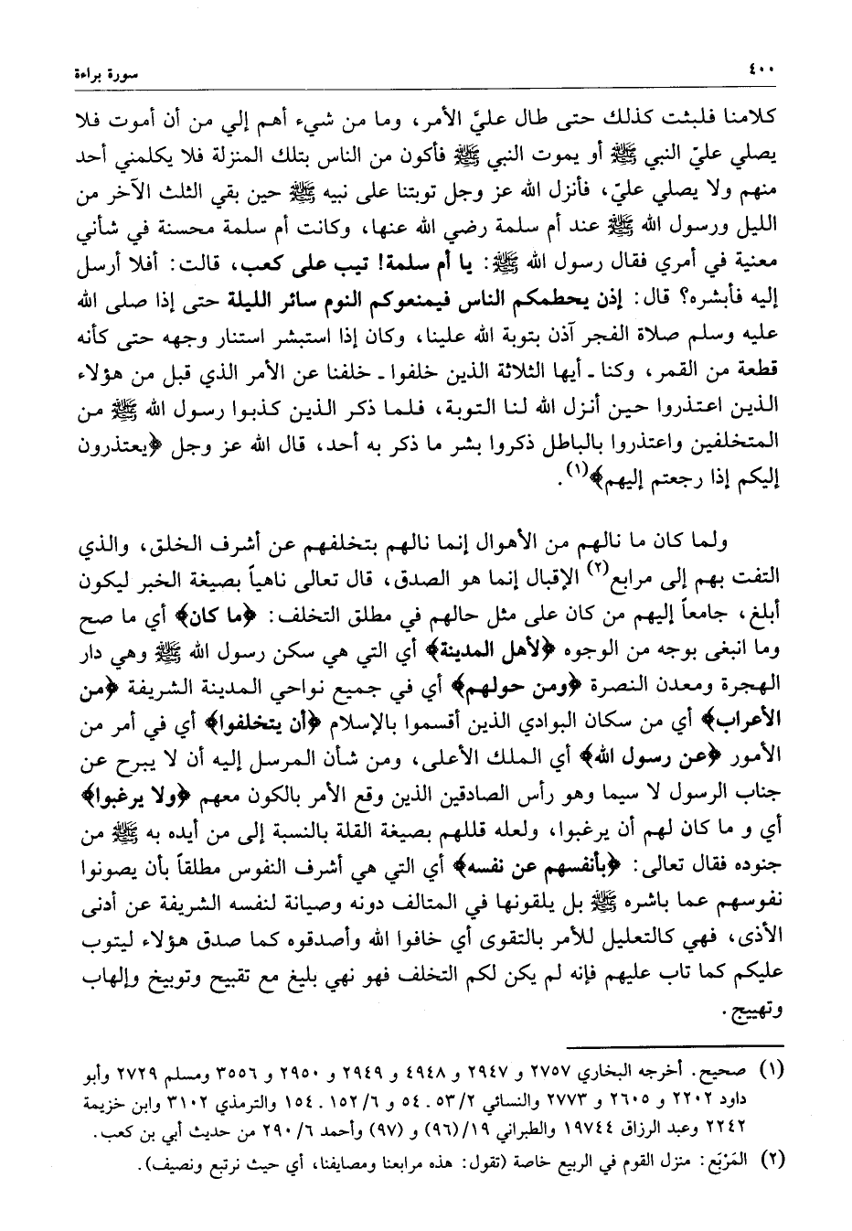 كلامنا فلبثت كذلك حتى طال عليّ َ الأمر ، وما من شيء أهم إلي من أن أموت فلا يصلي عليّ النبي ( صلى الله عليه وسلم ) أو يموت النبي ( صلى الله عليه وسلم ) فأكون من الناس بتلك المنزلة فلا يكلمني أحد منهم ولا يصلي عليّ ، فأنزل الله عز وجل توبتنا على نبيه ( صلى الله عليه وسلم ) حين بقي الثلث الآخر من الليل ورسول الله ( صلى الله عليه وسلم ) عند أم سلمة رضي الله عنها ، وكانت أم سلمة محسنة في شأني معنية في أمري فقال رسول الله ( صلى الله عليه وسلم ) : ( ياأم سلمة تيب على كعب ، ) قالت : أفلا أرسل إليه فأشره ؟ قال : ( إذن يحطكم الناس فيمنعوكم النوم سائر الللية ) حتى إذا ( صلى الله عليه وسلم ) صلاة الفجر آذن بتوبة الله علينا ، وكان إذا استبشر استنار وجهه كتى كأنه قطعة من القمر ، وكنا - أيها الثلاثة الذين خلفوا - خلفنا عن الأمر الذي قبل من هؤلاء الذين اعتذروا حين أنزل الله لنا التوبة ، فلما ذكر الذين كذبوا رسول اله ( صلى الله عليه وسلم ) من المختلفين واعتذروا بالباطل ذكروا بشر ما ذكر به أحد ، قال الله عز وجل ) يعتذرون إليكم إذا رجعتم إليهم ( .