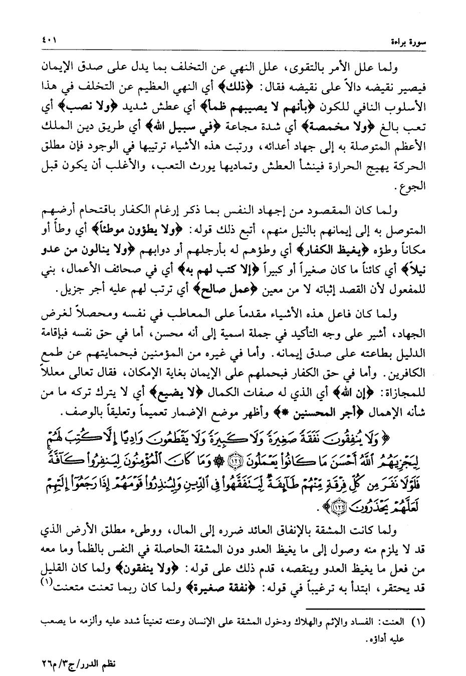 ) وَلاَ يُنفِقُونَ نَفَقَةً صَغِيرَةً وَلاَ كَبِيرَةً وَلاَ يَقْطَعُونَ وَادِياً إِلاَّ كُتِبَ لَهُمْ لِيَجْزِيَهُمُ اللَّهُ أَحْسَنَ مَا كَانُواْ يَعْمَلُونَ وَمَا كَانَ الْمُؤْمِنُونَ لِيَنفِرُواْ كَآفَّةً فَلَوْلاَ نَفَرَ مِن كُلِّ فِرْقَةٍ مِّنْهُمْ طَآئِفَةٌ لِّيَتَفَقَّهُواْ فِي الدِّينِ وَلِيُنذِرُواْ قَوْمَهُمْ إِذَا رَجَعُواْ إِلَيْهِمْ لَعَلَّهُمْ يَحْذَرُونَ ( ( )