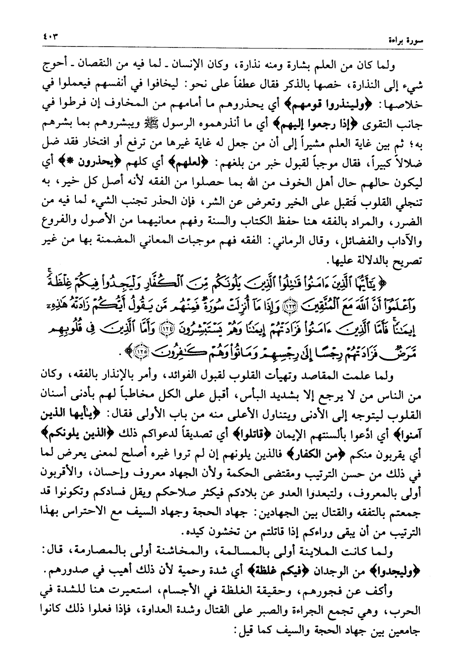 ) يأَيُّهَا الَّذِينَ آمَنُواْ قَاتِلُواْ الَّذِينَ يَلُونَكُمْ مِّنَ الْكُفَّارِ وَلِيَجِدُواْ فِيكُمْ غِلْظَةً وَاعْلَمُواْ أَنَّ اللَّهَ مَعَ الْمُتَّقِينَ وَإِذَا مَآ أُنزِلَتْ سُورَةٌ فَمِنْهُمْ مَّن يَقُولُ أَيُّكُمْ زَادَتْهُ هَذِهِ إِيمَاناً فَأَمَّا الَّذِينَ آمَنُواْ فَزَادَتْهُمْ إِيمَاناً وَهُمْ يَسْتَبْشِرُونَ وَأَمَّا الَّذِينَ فِي قُلُوبِهِم مَّرَضٌ فَزَادَتْهُمْ رِجْساً إِلَى رِجْسِهِمْ وَمَاتُواْ وَهُمْ كَافِرُونَ ( ( )