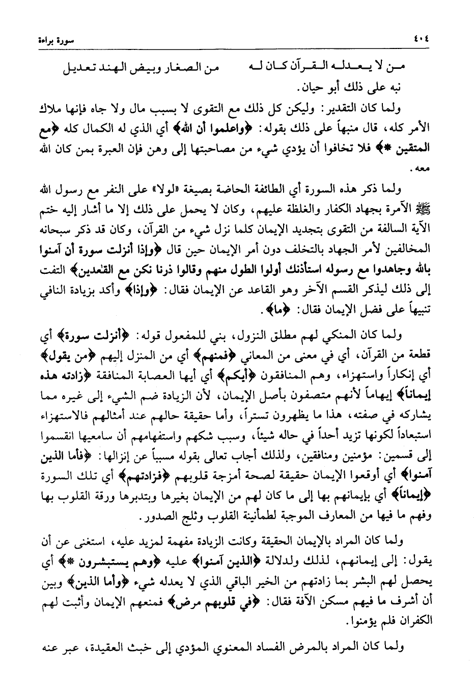 ولما ذكر هذه السورة أي الطائفة الحاضة بصيغة ( لولا ) على النفر مع رسول الله ( صلى الله عليه وسلم ) الآمرة بجهاد الكفار والغلطة عليهم ، وكان لا يحمل على ذلك إلا ما أشار إليه ختم الآية السالفة من التقوى بتجديد الإيمان كلما نزل شيء من القرآن ، وكان قد ذكر سبحانه المخالفين لأمر الجهاد بالتخلف دون أمر الإيمان حين قال ) وإذا أنزلت سورة أن آمنوا بالله وجاهدوا مع رسوله استأذنك أولو الطول منهم وقالوا ذرنا نكن مع القاعدين ( التفت إلى ذلك ليذكر القسم الآخر وهو القاعد عن الإيمان فقال : ( وإذا ( وأكد بزيارة النافي تنبيهاً على فضل الإيمان فقال : ( ما ( ولما كان المنكى لهم مطلق النزول ، للمفعول قوله : ( أنزلت سورة ) أي قطعة من القرآن ، أي في معنى من المعاني ) فمنهم ) أي من المنزل إليهم ) من يقول ) أي إنكاراً واستهزاء ، وهم المنافقون ) أيكم ) أي أيها العصابة المنافقة ) زادته هذه إيماناً ( إيهاماً لأنهم متصفون بأصل الإيمان ، لأن الزيادة ضم الشيء إلى غير مما يشاركه في صفت ، هذا ما يظهرون تستراً ، وأما حقيقة حالهم عند أمثالهم فالاستهزاء استبعاداً لكونها تزيد أحداً في حاله شيئاً ، وسبب شكهم واستفهامهم أن سامعيها انقسموا إلى قسمين ، مؤمنين ومنافقين ، ولذلك أجاب تعالى بقوله مسبباً عن إنزالها : ( فأما الذين آمنوا ) أي أوقعوا الإيمان حقيقة لصحة أمزجة قلوبهم ) فزادهم ) أي تلك السورة ) إيماناً ) أي إيمانهم بها إلى ما كان لهم من الإيمان بغيرها وبتد برها ورقة القلوب بها وفهم ما فيها من المعارف الموجبة لطمأنينة القلوب وثلج الصدور .