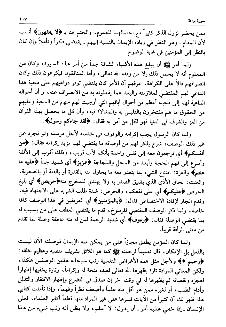 ولما كان المؤمن يطلق مجازاً على من يمكن منه الإيمان فوصلته الان ليست بالفعل بل الإمكان ، قال تعميماً لرحمته ( صلى الله عليه وسلم ) كما هو اللائق بشريف منصبه وعظيم خلقه : ( رحيم ( ولأجل مثل هذه الأغراض النفسية رتب سبحانه هذين الوصفين هكذا ، ولكن المعاني المراده تارة يظهرها الله نعالى لعبده منحة له وإكراماً ، وتارة يخفيها إظهاراً لعجزه ونقصانه ثم يظهرها له في وقت آخر إن صدق في التضرع وإظهار الافتقار والتذلل وأدام الطلب ، أو لغيره ممن هو أقل منه علماً وأضعف نظراً وفهماً ، وإذا تاملت كتابي هذا ظهر لك أن كثيراً من الآيات فسرها على غير المراد منها قطعاً أكابر العلماء ، فعلى الأنسان - إذا خفي عليه أمر - أن يقول : لا أعلم ، ولا يظن أنه رتب شيء من هذا