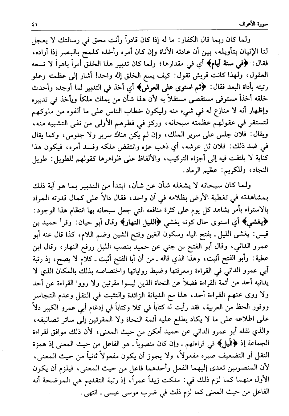 ولما كان سبحانه لا يشغله شان عن شأن ، ابتدأ من التدبير هو آية ذلكبمشاهدته في تغطية الرض بظلامه في آن واحد ، فقال على الكمال قدرته المراد بالاستواء بأمر يشاهد كل يوم على كثرة منافعة التي جعل سبحانه بها انتظامهذا الوجود ) يغشي ( اي استوى حال كونه يغشي ) الليل النهار ( وقال أبو حيان : قراء حميد بن قبس : يغشى الليل - بفتح بن جني عنحميد بنصب الليل ورفع النهار ، وقال ابن عطية : وابو الفتح أثبت ، وهذا الذي قاله - من أن أبا الفتح أثبت - كلام لا يصح ، إذ رتبة أبي عمرو الداني أحد من أئمة القراءة فضلاً عن النجاة الذين ليسوامقرئين ولا رووا القراءة عن أحد ولا روى عنهم القراءة أحد ، هذا مع الديانة الزائدة والتثبيت في النقل وعدم التجاسر ووفور الحظ من الحظ ، فقد رايت له كتاباً في كلا وكتاباً في إدغام أبي عمرو الكبير دلاً على إطلاعه على ما لا يكاد يطلع عليه ائمة النجاة ولا المقرئين إلى سائر تصانيفه ، والذي نقله أبو عمرو الداني عن حميد امكن من حيث المعنى ، لأن ذلك موافق لقراءة الجماعة إذ ) اليّل ( في قراءتهم - وإن كان منصوباً - هو الفاعل من حيث المعنى ، إذ همزة النقل أو التضعيف صيرة مفعولاً ، ولا يجوز ان يكون مفعولاً ثانياً من حيث المعنى ، لأن المنصوبين تعدى إليهما الفعل واحدهما فاعل من حيث المعنى ، فليلزم أن يكون الأول منهما كما لزم ذلك في : ملكت زيداً عمراً ، إذ رتبة التقديم هي الموضحة أنه الفاعل من حيث المعنى كما لزم ذلك في ضرب موسى عيسى - انتهى .