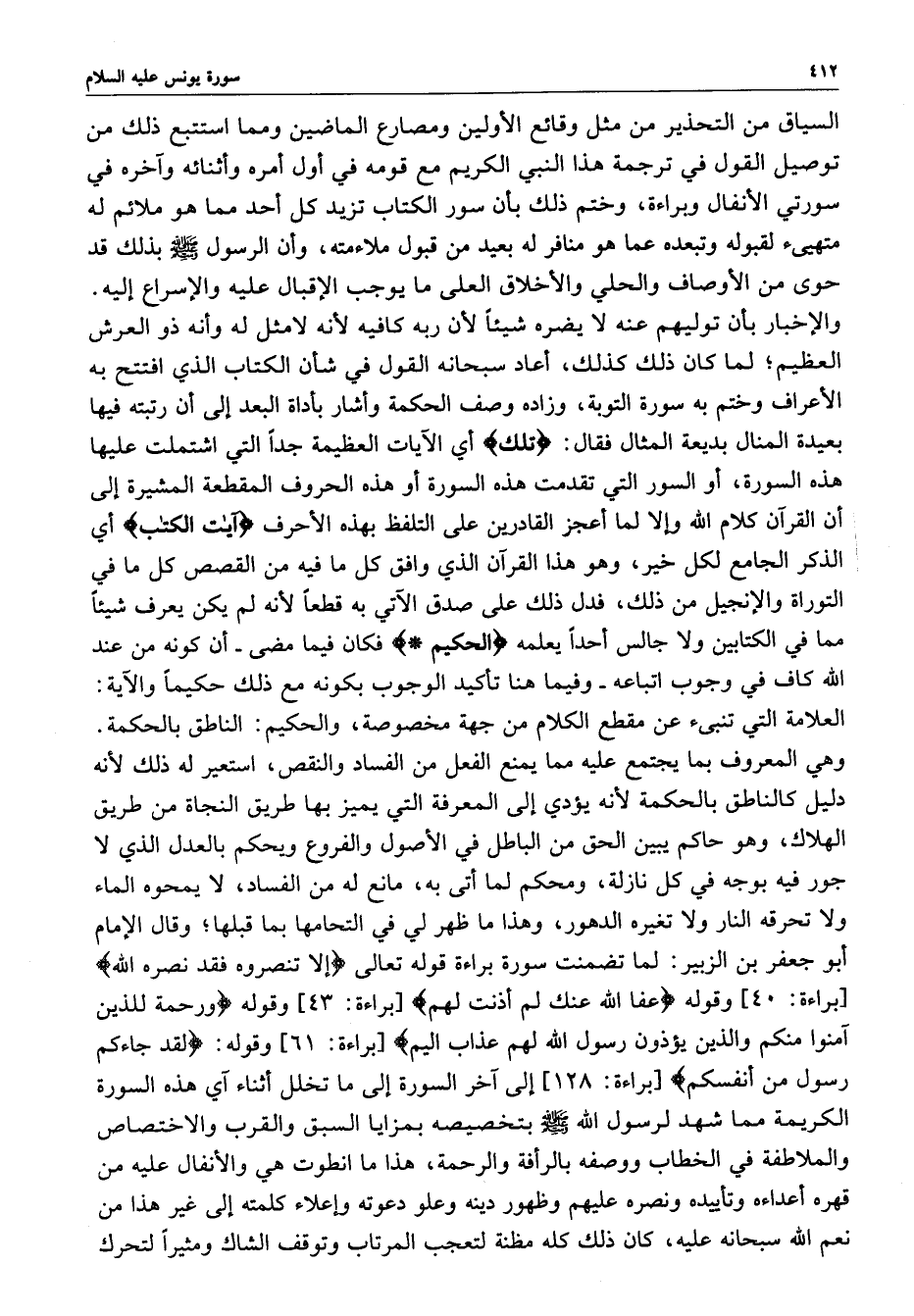 والإخبار بأن توليهم عنه لا يضره شيئاً لأن ربه لامثل له وأنه ذو العرش العظيم ؛ لما كان ذلك كذلك ، اعاد سبحانه القول في شأن الكتاب الذي افتتح به الأعراف وختم سورة التوبة ، وزاده وصف الحكمه وأشار بأداة البعد إلى رتبته فيها بعيدة المنال بديعة المثال فقال : ( تلك ) أي الآيات العظيمة جداً التي اشتملت عليها هذه السورة ، أو السور التي تقدمت هذه السورة أو هذا القرآن الذي وافق كل ما فيه من القصص كل ما في التوارة والإنجيل من ذلك ، فدل ذلك على صدق الآتي به قطعاً لأنه لم يكن يعرف شيئاً مما في في الكاتبين ولا جالس أحداً يعلمه ) الحكيم ( فكان فيما مضى - أن كونه من عند الله كاف في وجوب اتباعه ، وفيما هنا تأكيد الوجوب بكونه مع ذلك حكيماً والآية : دليل كالناطق بالحكمة لأنه يؤدي إلى النعرفة التي يميز بها طريق النجاة من طريق الهلاك ، وهو حاكم يبين الحق من الباطل في الأصول والفروع ويحكم بالعدل الذي لا جور فيه بوجه في كل نازلة ، ومحكم لما أتى به ، مانع طريق النجاة من طريق الهلاك ، وهو حاكم يبين الحق من الباطل في الأصول والفروع ويحكم بالعدل الذي لا جور فيه بوجه في كل نازلة ، ومحكم لما أتى به ، مانع له من الفساد ، لا يمحوه الماء ولا تحرقه النار ولا تغيره الدهور ، وهذا ما ظهر لي في التحامها بما قبلها ؛ وقال الإمام أبو جعفر بن الزبير : لما تضمنت سورة براءة قوله تعالى
