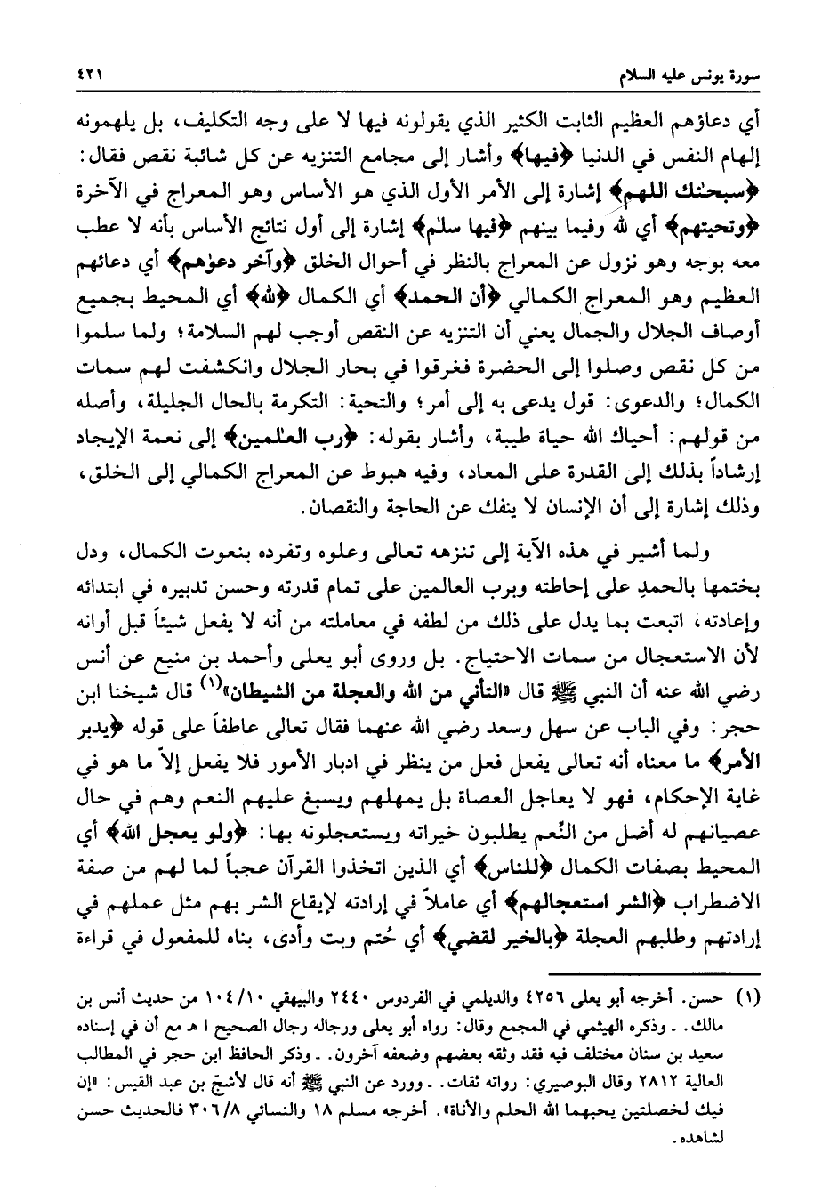 ولما أشير في هذه الآية إلى تنزهه تعالى وعلوه وتفرده بنعوت الكمال ، ودل بختمها بالحمدِ على إغحاطته وبرب العالمين على تمام قدرته وحسن تدبيره في ابتدائه وإعادته ، اتبعت بما يدل على ذلك من لطفه في معاملته من أنه لا يفعل شيئاً قبل أوانه لأن الاستعجال من سمات الاحتياج. بل وروى أبو يعلى وأحمد بن بن منيع عن أنس رضي الله عنه ان النبي ( صلى الله عليه وسلم ) قال ( التأني من الله والعجلة من الشيطان ) قال شيخنا ابن حجر : وفي الباب عن سهل وسعد رضي الله عنهما فقال تعالى عاطفاً على قوله ) يدبرالأمر ( ما معناه أنه تعالى يفعل فعل من ينظر في ادبار فلا يفعل إلاّ ما هو في غاية الإحكام ، فهو لا يعاجل العصاة بل يمهلهم ويسبغ عليهم النعم وهم في حال عصيانهم له أضل من النَّعم يطلبون خبراته ويستعجلونه بها : ( ولو يعجل الله ( اي المحيط بصفات الكمال ) للناس ( اي الذين اتخذوا القرآن عجباً لما لهم من صفة الاضطراب ) الشر استعجالهم ( اي عاملاً في إرادته لإيقاع الشر بهم مثل عملهم في إرادتهم وطلبهم العجلة ) بالخير لقضى ( اي حُتم وبت وأدى ، بناه للمفعول في قراءة
