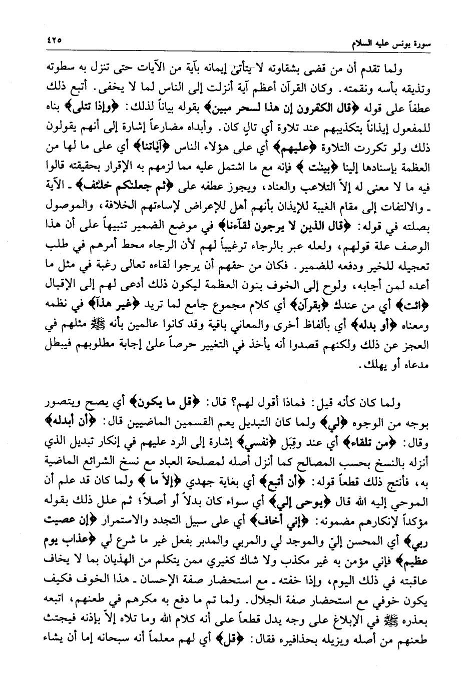 ولما كان كأنه قيل : فماذا أقول لهم ؟ قال : ( قل ما يكون ) أي يصح ويتصور بوجه من الوجوه ) لي ( ولما كان التبديل يعم القسمين الماضيين قال : ( أن أبدله ( وقال : ( من تلقاء ) أي عند وقبل ) نفسي ( إشارة إلى الرد عليهم في إنكار تبديل الذي أنزله بالنسخ بحسب المصالح كما أنزل أصله لمصلحة العباد مع نسخ الشرائع الماضية به ، فأنتج ذلك قطعاً قوله : ( أن أتبع ) أي بغاية جهدي ) إلاّ ما ( ولما كان قد علم أن الموحي إليه الله قال ) يوحى إلي ( اي سواء كان بدلاً أو أصلاً ؛ ثم علل ذلك بقوله مؤكداً لإنكارهم مضمونه : ( إني أخاف ) أي على سبيل التجدد والاستمرار ) إن عصيت ربي ) أي المحسن إليّ والموجد لي والمربي والمدبر بفعل غير ما شرع لي ) عذاب يوم عظيم ( فإني مؤمن به غير مكذب ولا شاك كغيري ممن يتكلم من الهذيان بما لا يخاف عاقبته في ذلك اليوم ، وإذا خفته - مع تم ما دفع به مكرهم في طعنهم ، اتبعه بعذره ( صلى الله عليه وسلم ) في الإبلاغ على وجه يدل قطعاً على انه كلام الله وما تلاه إلاّ بإذنه فيجتث طعنهم من أصله ويزيله بحذافيره فقال : ( قل ( اي لهم معلماً أنه سبحانه إما أن يشاء