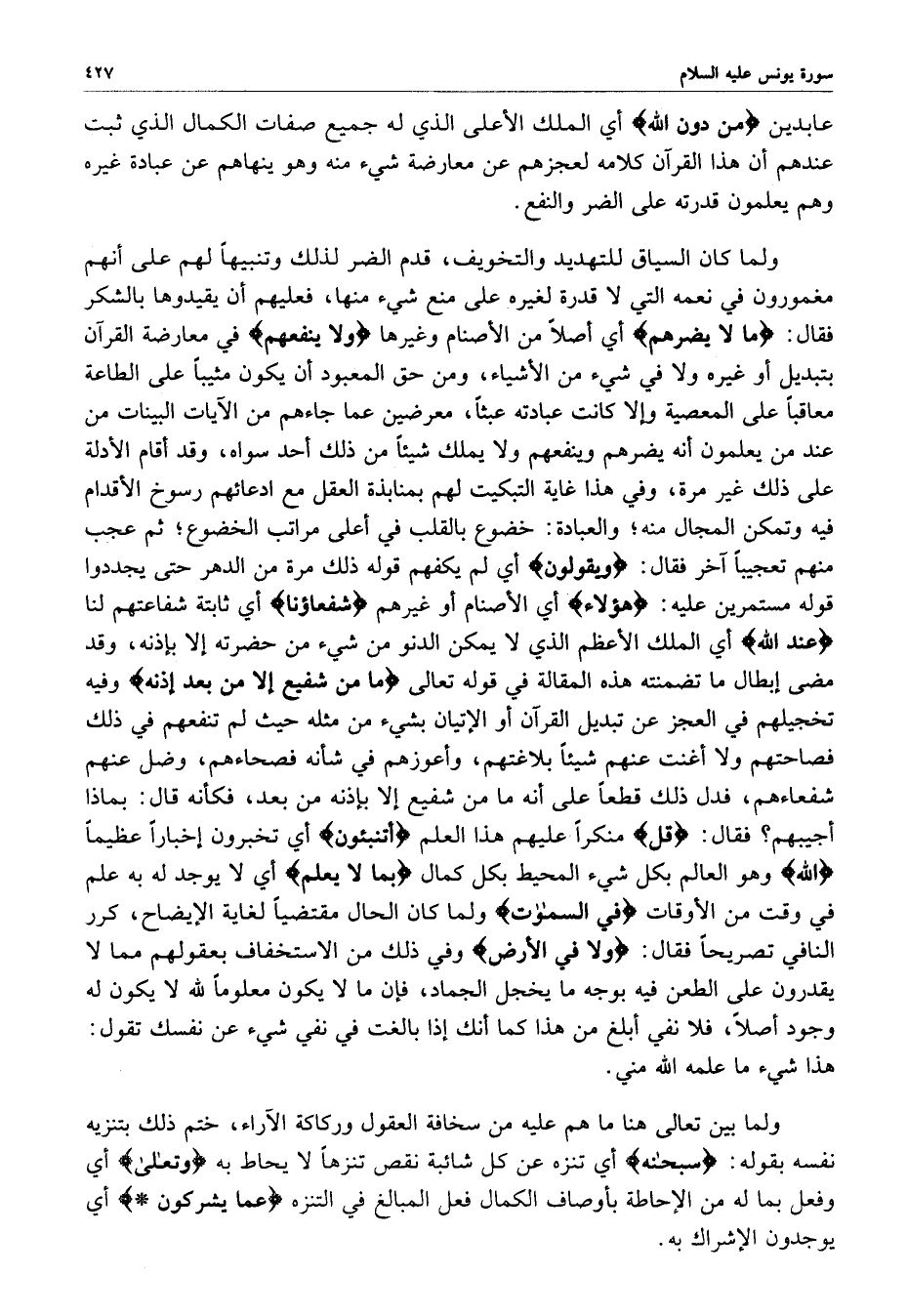 ولما كان السياق للتهديد والتخويف ، قدم الضر لذلك وتنبيهاً لهم على انهم مغمورون في نعمه التي لا قدرة لغيره على منع شيء منها ، فعليهم ان يقيدوها بالشكر فقال : ( مالا يضرهم ( اي أصلاًمن الأصنام وغيرها ) ولا ينفعهم ( في معارضة القرآن معاقباً على المعصية وإلا كانت عبادته عبثاً ، معرضين عما جاءهم من الآيات البينات من عند من يعلمون أنه يضرهم وينفعهم ولا يملك شيئاً من ذلك أحد سواه ، وقد أقام الأدلة على ذلك غير مرة ، وفي هذا غاية التبكيت لهم بمنابذة العقل مع غدعائهم رسوخ الأقدام فيه وتمكن المجال منه ؛ والعبادة : خضوع بالقلب في أعلى مراتب الخضوع ؛ ثم عجب منهم تعجباً آخر فقال : ( ويقولون ) أي لم يكفهم قوله ذلك مرة من الدهر حتى يجددوا قوله مستمرين عليه : ( هؤلاء ) أي الأصنام أو غيرهم ) شفعاؤنا ) أي ثابته شفاعتهم لنا ) عند الله ) أي الملك الأعظم الذي لا يمكن الدنو من شيء من حضرته إلا بإذنه ، وقد تخجيلهم في العجز عن تبديل القرآن أو الإتيان بشيء من مثله حيث لم تنفعهم فيذلك فصاحتهم ولا أغنت عنهم شيئاً بلاغتهم ، وأعوزهم في شأنه فصحاءهم ، وضل عنهم شفعاءهم ، فدل ذلك قطعاً على أنه ما من شفيع إلا بإذنه من بعد ، فكأنه قال : بماذا أجيبهم ؟ فقال : ( قل ( منكراً عليهم هذا العلم ) أتنبئون ) أي تخبرون إخباراً عظيماً ) الله ( وهو العالم بكل شيء المحيط بكل كمال ) بما لا يعلم ) أي لا يوجد له به علم في وقت من الأوقات ) في السموات ( ولما كان الحال مقتضياً لغاية الإيضاح ، كرر النافي تصريحاً فقال : ( ولا في الأرض ( وفي ذلك من الاستخفاف بعقولهم مما لا يقدرون على الطعن فيه بوجه ما يخجل الجماد ، فإن ما لا يكون معلوماً لله لا يكون له وجود اصلاً ، فلا نفى أبلغ من هذا كما أنك إذا بالغت في نفي شيء عن نفسك تقول : هذا شيء ما عمله الله مني .
