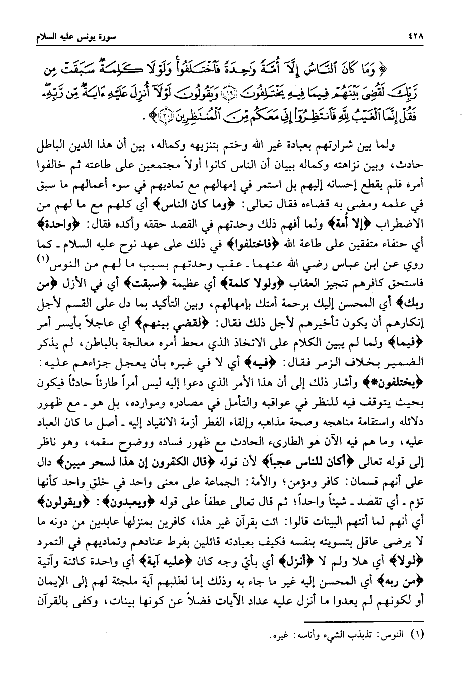 ) وَمَا كَانَ النَّاسُ إِلاَّ أُمَّةً وَاحِدَةً فَاخْتَلَفُواْ وَلَوْلاَ كَلِمَةٌ سَبَقَتْ مِن رَّبِّكَ لَقُضِيَ بَيْنَهُمْ فِيمَا فِيهِ يَخْتَلِفُونَ وَيَقُولُونَ لَوْلاَ أُنزِلَ عَلَيْهِ آيَةٌ مِّن رَّبِّهِ فَقُلْ إِنَّمَا الْغَيْبُ للَّهِ فَانْتَظِرُواْ إِنِّي مَعَكُمْ مِّنَ الْمُنتَظِرِينَ ( )