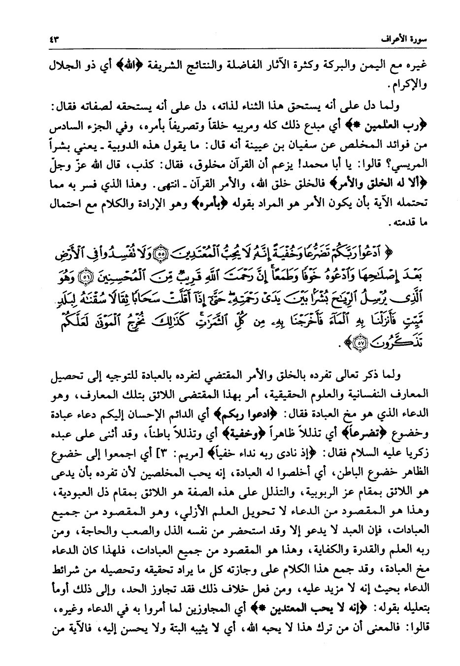 ) ادْعُواْ رَبَّكُمْ تَضَرُّعاً وَخُفْيَةً إِنَّهُ لاَ يُحِبُّ الْمُعْتَدِينَ وَلاَ تُفْسِدُواْ فِي الأَرْضِ بَعْدَ إِصْلاَحِهَا وَادْعُوهُ خَوْفاً وَطَمَعاً إِنَّ رَحْمَةَ اللَّهِ قَرِيبٌ مِّنَ الْمُحْسِنِينَ وَهُوَ الَّذِي يُرْسِلُ الرِّيَاحَ بُشْرىً بَيْنَ يَدَيْ رَحْمَتِهِ حَتَّى إِذَآ أَقَلَّتْ سَحَاباً ثِقَالاً سُقْنَاهُ لِبَلَدٍ مَّيِّتٍ فَأَنْزَلْنَا بِهِ الْمَآءَ فَأَخْرَجْنَا بِهِ مِن كُلِّ الثَّمَرَاتِ كَذلِكَ نُخْرِجُ الْموْتَى لَعَلَّكُمْ تَذَكَّرُونَ ( ( )