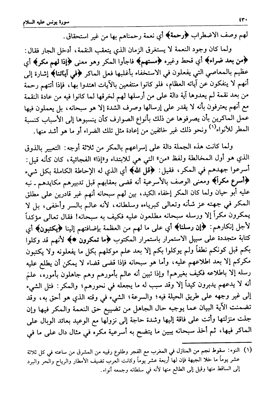ولما كانت هذه الجملة دالة على إسراعهم بالمكر من ثلاثة أوجه : التعبير بالذوق الذي هو أول المخالطة ولفظ ( من ) التي هي للابتداء و ( إذا ) الفجائية ، كان كأنه قيل : أسرعوا جهدهم في المكر فقيل : ( قل الله ) أي الذي له له الإحاطة الكاملة بكل شيء ) أسرع مكراً ( ومعنى اوصف بالأسرعة أنه قضى بعقابهم قبل تدبيرهم مكايدهم - نبه عليه أبو حيان ولما كان المكر إخفاء الكيد ، بين لهم سبحانه أنهم غير قادرين على مطلق المكر في جهته عز شأنه وتعالى كبرياءه وسلطانه ، لأنه عالم بالسر وأخفى ، بل لا يمكرون مكراً إلا ورسله سبحانه مطلعون عليه فكيف به سبحانه فقال تعالى مؤكداً لأجل إنكارهم : ( إن رسلنا ) أي على ما لهم من العظمة بإضافتهم إلينا ) يكتبون ) أي كتابة متجددة على سبيل الاستمرار باستمرار المكتوب ) ما تمكرون ( لأنهم قد وكلوا بكم قبل كونكم نطفاً ولم يوكلوا بكم إلا بعد علم موكلهم بكل ما يفعلونه ولا يكتبون مكركم إلا بعد اطلاعهم عليه ، واما هو سبحانه فإذا قضى لا يمكن أن يطلع عليه رسله إلا باطلاعه فكيف بغيرهم وإذا تبين انه عالم بأمورهم وهم جاهلون بأموره ، علمَ أنه لا يدعهم يدبرون كيداً إلا وقد سبب له ما يجعله في نحورهم ؛ والمكر : فتل الشيء إلى غير وجهه على طريق الحيلة فيه ؛ والسرعة ؛ الشيء في وقته الذي هو أحق به ، وقد تضمنت الآ ؟ ية البيان عما يوجبه حال الجاهل من تضييع حق النعمة والمكر فيها وإن جلت منزلتها وأتت على فاقة إليها وشدة حاجة إلى نزولها مع الوعيد بعائد الوبال على الماكر فيها ، ثم أخذ سبحانه يبين ما يتضح به أسرعية مكره في مثال دال على ما في