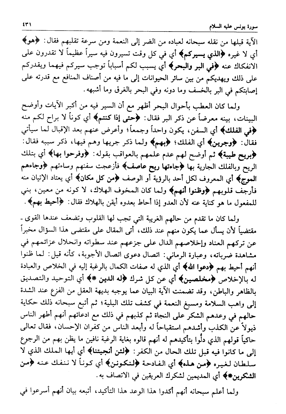 ولما كان العطب بأحوال البحر اظهر مع ان السير فيه من اكبر الآيات وأوضح البينات ، بينه معرضاً عن ذكر البر فقال : ( حتى إذا كنتم ) أي كوناً لا براح لكم منه ) في الفلك ( اي السفن ، يكون واحداً وجمعاً ؛ وأعرض عنهم بعد الإقبال لما سيأتي فقال : ( وجرين ) أي الفلك ؛ ) بهم ( ولما ذكر جريها وهم فيها ، ذكر سببه فقال : ( بريح طيبة ( ثم أوضح لهم عدم علمهم بالعواقب بقوله : ( وفرحوا بها ) أي بتلك الريح وبالفلك الجارية بها ) جاءتها ريح عاصف ( فأزعجت سفنهم وساءتهم ) وجاءهم الكوج ) أي المعروف لكل أحد بالرؤية أو الوصف ) من كل مكان ( اي يعتاد الإتيان منه فأرجف قلوبهم ) وظنوا انهم ( ولما كان المخوف الهلاك ، لا كونه من معين ، بيني للمفعول ما هو كناية عنه لأن العدو إذا أحاط بعدوه أيقن بالهلاك فقال : ( احيط بهم. ( ولما كان ما تقدم من حالهم الغربية التي تجب لها القلوب وتضعف عندها القوى - مقتضياً لأن يسأل عما يكون منهم عند ذلك ، أتى المقال على مقتضى هذا السؤال مخبراً عن تركهم العناد وإخلاصهم الدال على جزعهم عند سطواته وانحلال عزائمهم في مشاهدة ضرباته ، وعبارة لرماني : اتصال الأجوبة ، كأنه قيل : لما ظنوا انهم احيط بهم ) دعواالله ) أي الذي له صفات الكمال بالرغبة إليه في الخلاص والعبادة له بالإخلاص ) مخلصين ) أي عن كل شرك ) له الدين ) أي التوحيد والتصديق بالظاهر والباطن ، وقد تضمنت الآية البيان عما يوجبه بديهة العقل من الفزع عند الشدة إلى واهب السلامة ومسبغ النعمة في كشف تلك البلية ؛ ثم أتبع سبحانه ذلك حكاية حالهم في وعدهم الشكر على النجاة ثم كذبهم في ذلك مع إدعائهم أنهم أطهر الناس ذيولاً عن الكذب وأشدهم استقباحاً له وأبعد الناس من كفران الإحسان ، فقال تعالى حاكياً قولهم الذي دلُّوا بتأكيدهم له أنهم قالوه بغاية الرغبة نافين ما يظن بهم من الرجوع إلى ما كانوا فيه قبل تلك الحال من الكفر : ( لئن أنجيتنا ) أي أيها الملك الذي لا سلطان لغيره ) من هذه ( اي الفادحه ) لنكونن ) أي كوناً لا ننفك عنه ) من الشاكرين ( اي المديمين لشكرك العريقين في الاتصاف به .