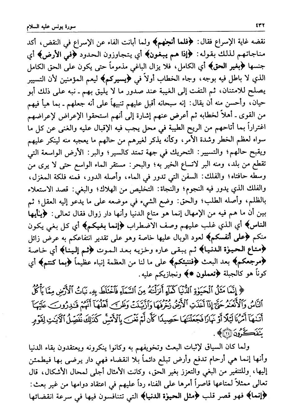 نقضه غاية الإسراع فقال : ( فلما انجاهم ( ولما أبانت الفاء عن الإسراع في النقض ، أكد مناجاتهم لذلك بقوله : ( إذا هم يبغون ) أي يتجاوزون الحدود ) في الأرض ( اي جنسها ) بغير الحق ) أي الكامل ، فلا يزال الباغي مذموماً حتى يكون على الحق الكامل الذي لا باطل فيه بوجه ، وجاء الخطاب أولاً في ) يسيركم ( ليعم المؤمنين لأن التسيير يصلح للامتنان ، ثم التفت إلى الغيبة عند صدور ما لا يليق بهم - نبه على ذلك أبو حيان ، وأحسن منه أن يقال : إنه سبحانه أ ؟ قبل عليهم تنبيهاً على أنه جعلهم - بما هيأ فيهم من الوى - اهلاً لخطابه ثم أعر عنهم إشارة إلى أنهم استحقوا الإعراض لإعراضهم اغتراراً بما أتاحهم ؛ والتسيير : التحريك في جهة تمتد كالسير ؛ والبر : الأرض الواسعة التي تقطع من بلد ، ومنه البر لاتساع الخير به ؛ والبحر : مستقر الماء الواسع حتى لا يرى من وسطه حافتاه ؛ والفلك : السفن التي تدور في الماء ، وأصله الدور ، فمنه فلكة المغزل ، والفلك الذي يدور في النجوم ؛ والحق : وضع الشيء في موضعه على ما يدعو إليه العقل ؛ ثم بين أن ما هم فيه من الإمهال إنما هو متاع الدنيا وأنها دار زوال فقال تعالى : ( يأيها الناس ) أي الذي غلب عليهم وصف الاضطارب ) إنما بغيكم ) أي كل بغي يكون منكم ) على أنفسكم ( لعود الوبال عليها خاصة وهو على تقدير انتفاعكم به عرض زائل ) متاع الحياة الدنيا ( ثم يبقى عاره وخزنه بعد الموت ) ثم إلينا ( اي خاصة ) مرجعكم ( بعد البعث ) فننبئكم ( على ما لنا من العظمة إنباء عظيماً ) بما كنتم ) أي كوناً هو كالجبلة ) تعلمون ( ونجازيكم عليه .