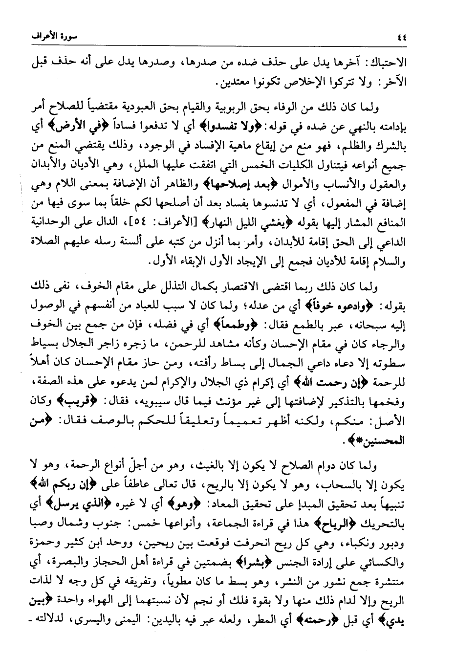 [ الأعراف : 54 ] الدال على الوحدانية الداعي إلى الحق إقامة للأبدان ، وامر بما أنزل من كتبه على السنة رسله عليهم الصلاة والسلام إقامة للأديان فجمع إلى الإيجاد الأول الإبقاء الأول ولما كان ذلك اقتضى الاقتصار بكمال التذلل على مقام الخوف ، نفي ذلك بقوله ) وادعوه خوفاً ) أي من عدله ؛ ولما كان لا سبب للعبادة من أنفسهم في الوصول إليه سبحانه ، عبر بالطمع فقال : ( وطمعاً ) أي في فضله ، فإن من جمع بين الخوف والرجاء كان في مقام الإحسان وكأنه مشاهد للرحمن ، ما زجره زاجر الجلال بسياط سطوته إلا دعاه داعي الجمال إلى بساط رافته ، ومن حاز مقام الإحسان كان أهلاً للرحمة ) إن رحمت الله ) أي إكرام ذي الجلال وافكرام لمن يدعوه على هذه الصفة ، وفخمها بالتذكير لإضافتها إلى غير مؤنث فيما قال سيبوية فقال : ( قريب ( وكان الأصل منكم ، ولكنه اظهر تعميماً وتعليقاً للحكم بالوصف فقال : ( من المحسنين ( ولما كان دوام الصلاح لا يكون إلا يكون بالغيث ، وهو من أجل أنواع الرحمة ، وهو لا يكون إلا بالسحاب ، وهو لا يكون إلا بالريح ، قال تعالى عاطفاً على ) إن ربكم الله ( تنبيهاً بعد تحقيق المبدأ على تحقيق المعاد : ( وهو ) أي لا غيره ) الذي يرسل ) أي بالتحريك ) الرياح ( هذا في قراءة الجماعة ، وانواعها خمس : جنوب وشمال وصبا ودبور ونكباء ، وهي كل ريح انحرفت فوقعت بين ريحين ، ووحد ابن كثير وحمزة والكسائي على إرادة الجنس ) بشرا ( بتضمين في قراءة اهل الحجاز والبصرة ، أي منتشرة جمع نشور من النشر ، وهو بسط ما كان مطوياً وتفرقه في كل وجه لا لذات الريح وإلا الدام ذلك منها ولا بقوة فلك أو نجم لأن نسبتها إلى الهواء واحدة ) بين يدي ) أي قبل ) رحمته ) أي المطر ، ولعله عبر فيه باليدين : اليمنى واليسرى ، لدلالته -
