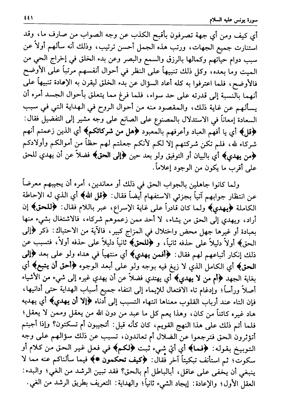 ولما كانوا جاهلين بالجواب الحق في ذلك أو معاندين ، أمره أن يجيبهم معرضاً عن انتظار جوابهم آتياًبجزئي الاستفهام ايضاً فقال : ( قل الله ) أي الذي له الإحاطة الكاملة ) يهدي ( ولما كان قادراً على غاية الإسراع ، عبر باللام فقال : ( للحق ( إن أراد ، ويهدي إلى الحق من يشاء ، لا أحد ممن زعموهم شركاء ، فالاشتغال بشيء منها بعبادة أو غيرها جهل محض واختلال في المزاج كبير ، فالآية من الاحتباك : ذكر ) إلى الحق ( اي الكامل الذي لا زيغ فيه بوجه ولو على ابعد الوجوه ) احق أن يتبع ) أي بغاية الجهد ) أم من لا يهدي ( اي يهتدي فضلاً عن أن يهدي غيره إلى شيء من الأشياء أصلاً ورأساً ؛ وإدغام تاء الافتعال للإيماء إلى انتفاء جميع أسباب الهداية حتى أدانيها ، فإن التاء عند ارباب القوب معنها انتهاء التسبب غلى أدناه ) إلا أن يهدي ( اي يهديه هاد غيره كائناًمن كان ، وهذا يعم كل ما عبد من دون الله من يعقل وممن لا يعقل ؛ فلما اتم ذلك علىهذا النهج القويمن كان كانه قيل : أتجيبون أم تسكتون ؟ وإذا أجبتم أتؤثرون الحق فترجعون عن الضلال أم تعاندون ، تسبب عن ذلك سؤالهم عى وجه التوبيخ بقوله : ( فما ( اي أيّشيء ثبت ) لكم ( في فعل غير الحق من كلام أو سكوت ؛ ثم استأنف تبكيتاً آخر فقال : ( كيف تحكمون ( فيما سألناكم عنه ممالا ينبغي ان يخفى على عاقل ، أبالباطل أم بالحق ؟ فقد تبين الرشد من الغي ؛ والبدء : العقل الأول ؛ والإعادة : إيجاد الشيء ثانياً ؛ والهداية : التعريف بطريق الرشد من الغي .