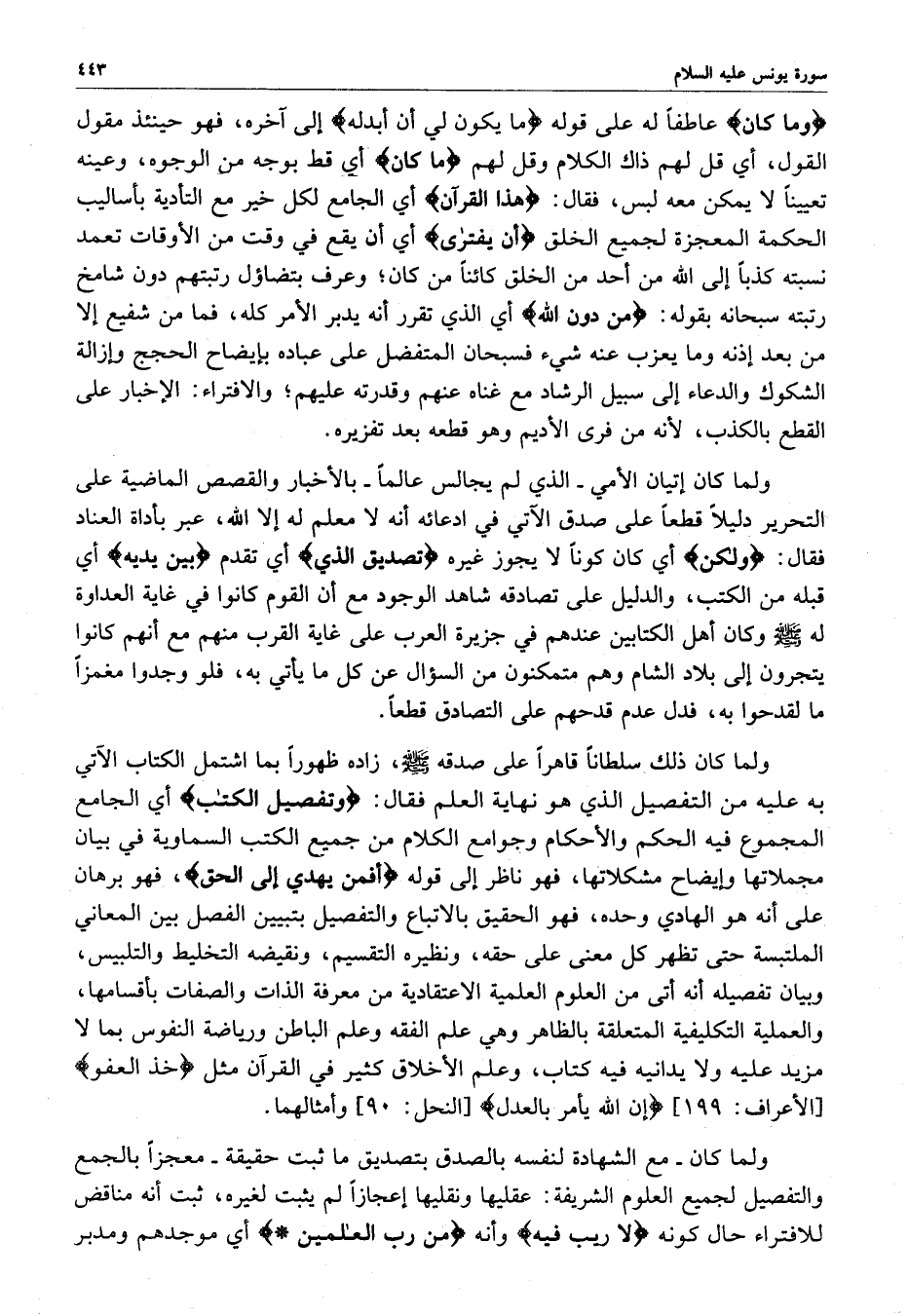 ولما كان ذلك سلطاناً قاهراً ( صلى الله عليه وسلم ) ، زاده ظهوراً بما اشتمل الكتاب الآتي به عليه من التفصيل الذي هو نهاية العلم فقال : ( وتفصيل الكتاب ) أي الجامع المجموع فيه الحكم والأحكام وجوامع الكلام من جميع الكتب السماوية في بيان مجملاتها وإيضاح مشكلاتها ، فهو الحقيق بالاتباع والتفصيل بتبيين الفصل بين المعاني الملتبسة حتى تظهر كل معنى على حقه ، ونظيره التقسيم ، ونقضيه التخلط والتلبيس ، وبيان تفصيله انه أتى من العلوم العلمية الاعتقادية من معرفة الذات والصفات بأقسامها ، والعلمية التكليفية المتعقة بالظاهر وهي علم الفقه وعلم الباطن ورياضة النفوس بما لا مزيد عليه و لا يدانيه فيه كتاب ، وعلم الأخلاق كثير في القرآن مثل