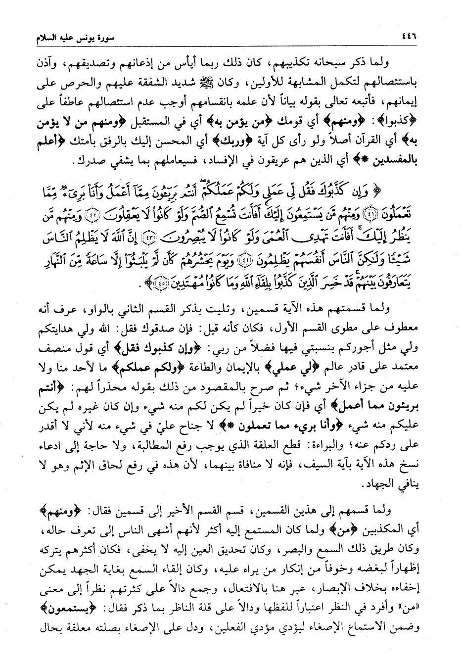 ) وَإِن كَذَّبُوكَ فَقُل لِّي عَمَلِي وَلَكُمْ عَمَلُكُمْ أَنتُمْ بَرِيئُونَ مِمَّآ أَعْمَلُ وَأَنَاْ بَرِيءٌ مِّمَّا تَعْمَلُونَ وَمِنْهُمْ مَّن يَسْتَمِعُونَ إِلَيْكَ أَفَأَنتَ تُسْمِعُ الصُّمَّ وَلَوْ كَانُواْ لاَ يَعْقِلُونَ وَمِنهُمْ مَّن يَنظُرُ إِلَيْكَ أَفَأَنْتَ تَهْدِي الْعُمْيَ وَلَوْ كَانُواْ لاَ يُبْصِرُونَ إِنَّ اللَّهَ لاَ يَظْلِمُ النَّاسَ شَيْئاً وَلَكِنَّ النَّاسَ أَنفُسَهُمْ يَظْلِمُونَ وَيَوْمَ يَحْشُرُهُمْ كَأَن لَّمْ يَلْبَثُواْ إِلاَّ سَاعَةً مِّنَ النَّهَارِ يَتَعَارَفُونَ بَيْنَهُمْ قَدْ خَسِرَ الَّذِينَ كَذَّبُواْ بِلِقَآءِ اللَّهِ وَمَا كَانُواْ مُهْتَدِينَ ( ( )