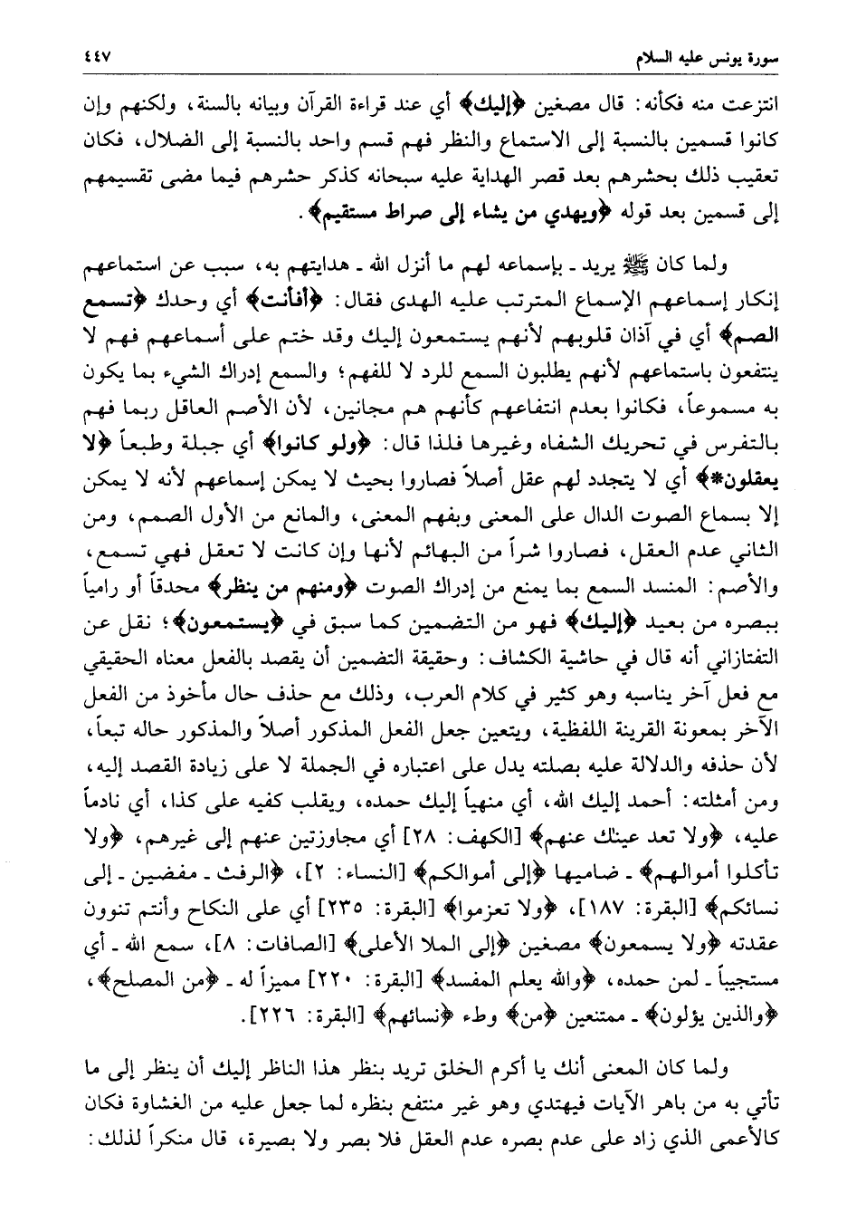 ولما كان ( صلى الله عليه وسلم ) يريد - بإسماعه لهم ما أنزل الله - هدايتهمبه ، سبب عن استماعهم إنكار إسماعهم الإسماع المرتب عليه الهدى فقال : ( أفأنت ) أي وحدك ) تسمع الصم ( اي في آذان قلوبهم لنهم يستمعون إليك وقد ختم على اسماعهم فهم لا ينتفعون باستماعهم لأنهم يطلبون السمع للرد والفهم ؛ والسمع إدراك الشيء بما يكون به مسموعاً ، فكانوا بعدم انتفاعهم كأنهم هم مجانين ، لأن الأصم العاقل ربما فهم بالتفرس في تحريك الشفاه وغيرها فلذا قال : ( ولو كانوا ( اي جبلة وطبعاً ) لا يعقلون ) أي لا يتجدد لهم عقل أصلاً فصاروا بحيث لا يمكن إسماعهم لنه لا يمكن إلا بسماع الصوت الدال على المعنى وبفهم المعنى ، والمانع من الأول الصمم ، ومن الثاني عدم العقل ، فصاروا شراًمن البهائم لأنها وإن كانت لا تعقل فهي تسمع ، والأصم : المنسدالسمع بما يمنع من إدراك الصوت ) ومنهم ينظر ( محدقاً أو رامياً ببصره من بعيد ) إليك ( فهو من التضمن كما سبق في ) يستمعون ( ؛ نقل عن التفتازاني أنه قال في حاشية الكشاف : وحقيقة التضمن أن يقصد بالفعل معناه الحقيقي مع فعل آخر يناسبه وهو كثير في كلام العرب ، وذلك مع حذف حال مأخوذ من الفعل الآخر بمعنوية القرينة اللفظية ، ويتعين جعل الفعل المذكرو أصلاً والمذكور حاله تبعاً ، لأن حذفه والدلالة عليه بصلته يدل على اعتباره في الجملة لا على زيادة القصد إليه ، ومن أمثلته : أحمد إليك الله ، أي منهياً إليك حمده ، ويقلب كفيه على كذا ، أي نادماً عليه ،