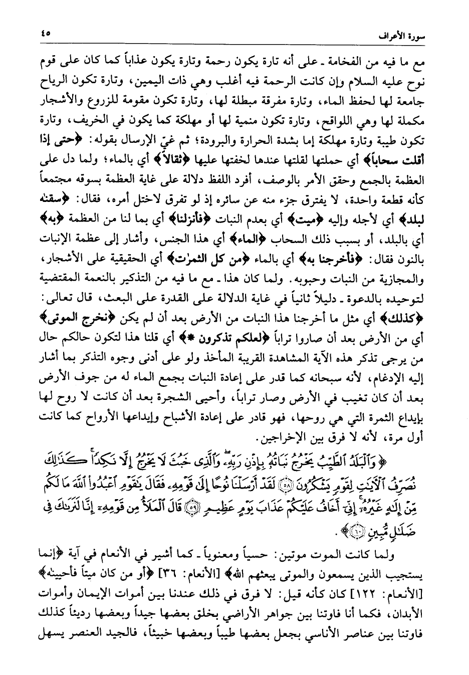 ولما كانت الموت موتين : حسياً ومنعنوياً - كما اشير في الأنعام في آية ) ) إنما يستجيب الذين يسمعون والموتى يبعثم الله ( ) [ الأنعام : 36 ] ) ) أو من كان ميتاً فأحييناه ( ) [ ألانعام : 122 ] كان كأنه قيل : لا فرق في ذلك عندما بين أموات الإيمان وأموات الأبدان ، فكما انا فاوتنا بين جواهر الراضي بخلق بعضها جيداً وبعضها رديئاً كذلك فاوتنا بين عناصر الناسي بجعل بعضها طيباً وبعضها خبيثاً ، فالجيد العنصر يسهل