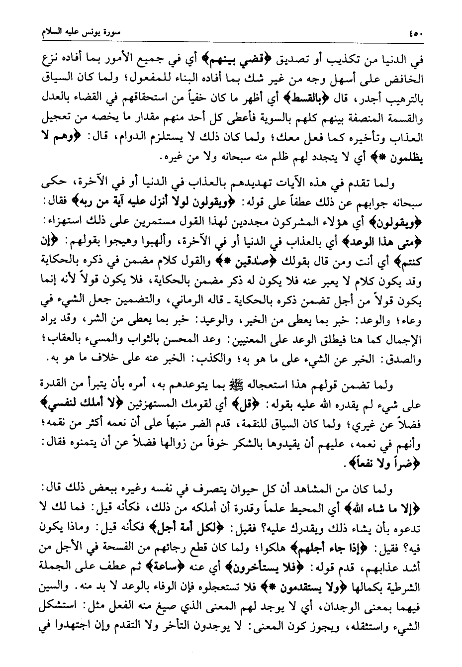 ولما تضمن قولهم هذا استعجاله ( صلى الله عليه وسلم ) بما يتوعدهم به ، أمره بأن يتبرأ من القدرة على شيء لم يقدره الله عليه بقوله : ( قل ) أي لقومك المستهزئين ) لا أملك لنفسي ( فضلاً عن غيري ؛ لما كان السيااق للنقمة ، قدم الضر منبهاً على أن نعمه أكثر من نقمة ؛ وأنهم في نعمه ، عليهم أن يقيدوها بالشكر خوفاً من زوالها فضلاً عن أن يتمنوه فقال : ( ضراً ولا نفعاً ( .