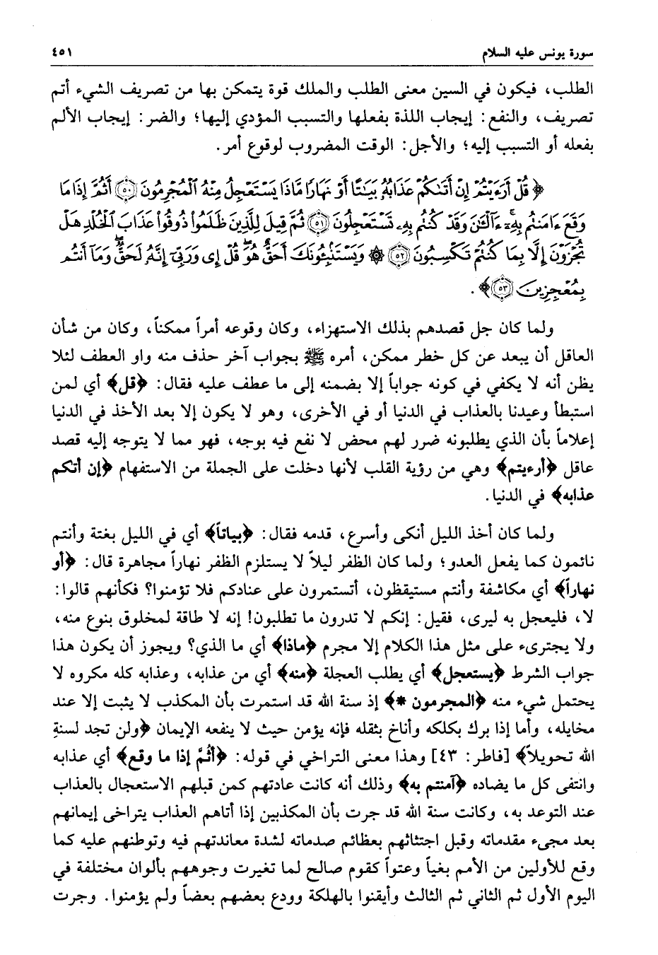 ) قُلْ أَرَأَيْتُمْ إِنْ أَتَاكُمْ عَذَابُهُ بَيَاتاً أَوْ نَهَاراً مَّاذَا يَسْتَعْجِلُ مِنْهُ الْمُجْرِمُونَ أَثُمَّ إِذَا مَا وَقَعَ آمَنْتُمْ بِهِ الآنَ وَقَدْ كُنتُم بِهِ تَسْتَعْجِلُونَ ثُمَّ قِيلَ لِلَّذِينَ ظَلَمُواْ ذُوقُواْ عَذَابَ الْخُلْدِ هَلْ تُجْزَوْنَ إِلاَّ بِمَا كُنتُمْ تَكْسِبُونَ وَيَسْتَنْبِئُونَكَ أَحَقٌّ هُوَ قُلْ إِي وَرَبِّي إِنَّهُ لَحَقٌّ وَمَآ أَنتُمْ بِمُعْجِزِينَ ( ( )