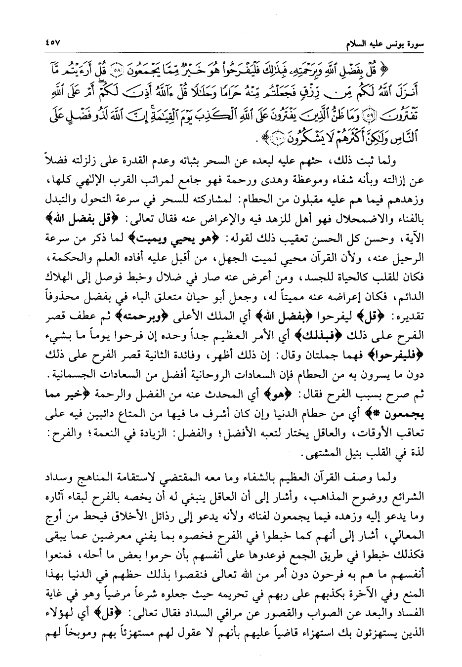 ولما ثبت ذلك ، حثهم عليه لبعده عن السحر بثباته وعدم القدرة على زلزلته فضلاً عن إزالته وبأن شفاء وموعظة وهدى ورحمة فهو جامع لمراتب القرب الإلهي كلها ، وزهدهم فيما هم عليه مقبلون من الحطام : لمشاركته للسحر في سرعة التحول والتبدل بالفناء والاضمحلال فهو أهل للزهد فيه والإعراض عنه فقال تعالى : ( قل بفضل الله ( الآية ، وحسن كل الحسن تعقيب ذلك لقوله : ( هو يحيي ويميت ( لما ذكر من سرعة الرحيل عنه ، ولأن القرآن محيي لميت الجهل ، من أقبل عليه أفاده العلم والحكمة ، فكان للقلب كالحياة للجسد ، ومن أعرض عنه صار في ضلال وخبط فوصل غلى الهلاك الدائم ، فكان إعراضه عنه مميتاً له ، وجعل أبو حيان متعلق الباء في بفضل محذوفاً تقديره : ( قل ( ليفرحوا ) بفضل الله ( اي الملك الأعلى ) وبرحمته ( ثم عطف قصر الفرح على ذلك ) فبذلك ) أي الأمر العظيم جداً وحده إن فرحوا يوماً ما بشيء ) فليفرحوا ( فهما جملتان وقال : ( هو ) أي المحدث عنه من الفضل والرحمة ) خير مما يجمعون ( اي من حطام الدنيا وإن كان أشرف ما فيها من المتاع دائبين فيه على تعاقب الأوقات ، والعاقل يختار لتعبه الأفضل ؛ والفضل : الزيادة في النعمة ؛ والفرح : لذة في القلب بنيل المشتهى .