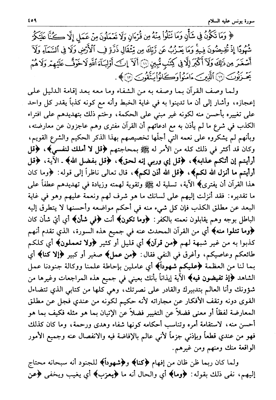 ولما وصف القرآن بماوصفه به من الشفاء وما معه بعد إقامة الدليل على إعجازه ، وأشار إلى أن ماتدينوا به في غاية الخبط وأنه مع كونه كذباً يقدر كل واحد على تغييره بأحسن منه لكونه غير مبني على الحكمة ، وختم ذلك بتهديدهم على افتراء الكذب في شرع ما لم يأذن به مع اعائهم أن القرآن مفترى وهم عاجزون عن معارضته ، وبأنهم لم يشركوه على نعمه التي أجلّها تخصيصهم بهذا بهذا الذكر الحكيم والشرع القويم ، وكان قد أكثر في ذلك كله من الأمر له ( صلى الله عليه وسلم ) بمحاجتهم ) قل لا أملك لنفسي ( ، ) قل أرأيتم إن أتاكم عذابه ( ، ) قل إي وربي إنه لحق ( ، ) قل بفضل الله ( - الآية ، ) قل أرأيتم ما أنزل الله لكم ( ، ) قل الله أذن لكم ( ، قال تعالى ناظراً إلى قوله : ( وما كان هذا القرآن أن يفترى ( الآية ، تسلية له ( صلى الله عليه وسلم ) وتقويه لهمته وزيادة في تهديدهم عطفاً على ما تقديره : فقد أنزلت إليهم على لسانك ما هو أشرف لهم ونعمة عليهم وهو في غاية البعد عن مطلق الكذب فإن كل شيء منه في أحكم مواضعه وأحسنها لا يتطرق إليه الباطل بوجه وهم يقابلون نعمته بالكفر : ( وما تكون ( أنت ) في شأن ) أي أيّ شأن كان ) وما تتلوا منه ) أي من القرآن المحدث عنه في جميع هذه السورة ، الذي تقدم أنهم طائعكم وعاصيكم ، وأغرق في النفي فقال : ( من عمل ( صغير أو كبير ) إلا كنا ) أي بما لنا من العظمة ) عليكم شهوداً ) أي عاملين بإحاطة علمنا ووكالة جنودنا عمل الشاهد ) إذ تفيضون فيه ( الآية إيذاناً بأنك بعيني في جميع هذه المراجعات وغيرها من شؤونك وأنا العلم بتدبيرك والقادر على نثرتك ، وهي كلها من كتابي الذي تتضاءل القوى دونه وتقف الأفكار عن مجاراته لأنه حكيم لكونه من عندي فجل عن مطلق المعارضة لفظاً أو معنى فضلاً عن التغيير فضلاً عن الإتيان بما هو مثله فكيف بما هو أحسن منه ، لا ستقامة أمره وتناسب أحكامه كونها شفاء وهدى ورحمة ، وما كان كذلك فهو من عندي قطعاً وبإذني جزماً لأني عالم بالإفاضة فيه والانفصال عنه وجميع الأمور الواقعة منك ومنهم ومن غيرهم .