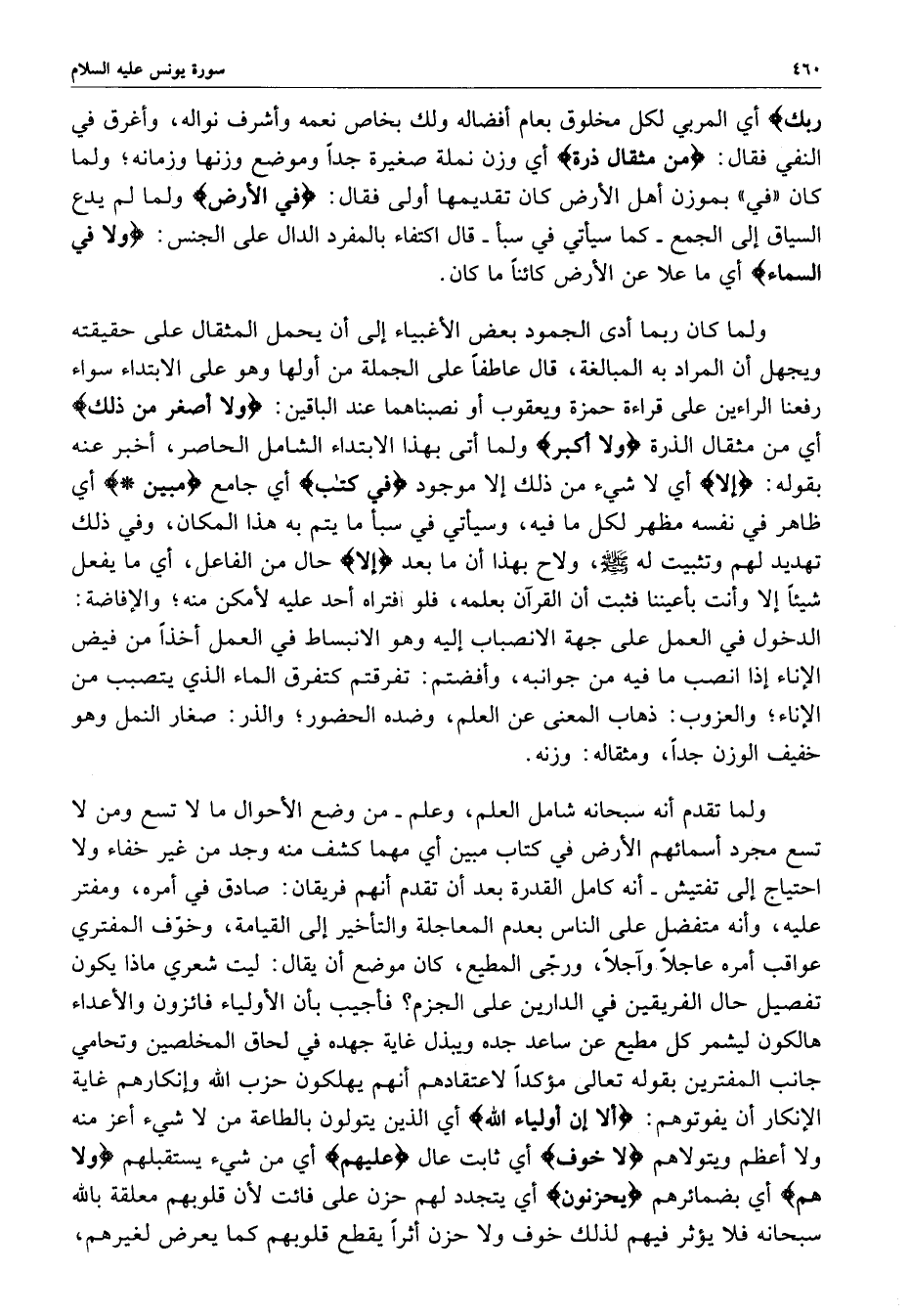 ولما كان ربما أدى الجمود بعض الأغبياء إلى أن يحمل المثقال على حقيقته ويجهل أن المراد به المبالغة ، قال عاطفاً على الجملة من اولها وهو على الابتداء سواء رفعنا الراءين على قراءة حمزة ويعقوب أو نصبناهما عند الباقين : ( ولا أصغر من ذلك ) أي من مثقال الذرة ) ولا أكبر ( ولما أتى بهذا الابتداء الشامل الحاصر ، اخبر عنه بقوله : ( إلا ) أي لا شيء من ذلك إلا موجود ) في كتاب ) أي جامع ) مبين ) أي ظاهر في نفسه مظهر لكل ما فيه ، وسيأتي في سبأ ما يتم به هذا المكان ، وفي ذلك تهديداً لهم وتثبيت له ( صلى الله عليه وسلم ) ، ولاح بهذا أن ما بعد ) إلا ( حال من الفاعل ، أي ما يفعل شيئاً إلا وأنت بأعيننا فثبت أن القرآن بعلمه ، فلو افتراه أحد عليه لأمكن منه ؛ والإفاضة : الدخول في العمل على جهة الانصباب إليه وهو الانبساط في العمل أخذاً من فيض الإناء إذا انصب ما فيه من جوانبه ، وأفضتم : تفرقتم كتفرق الماء الذي يتصبب من الإناء ؛ والعزوب : ذهاب المعنى عن العلم ، وضده الحضور ؛ والذر : صغار النمل وهو خفيف الوزن جداً ، ومثقاله : وزنه .