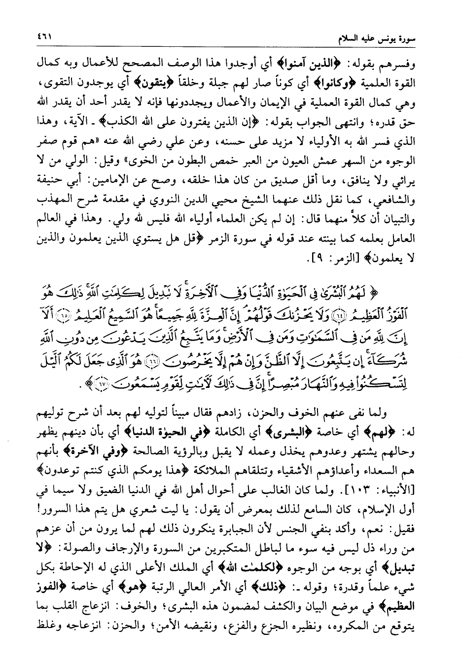 ) لَهُمُ الْبُشْرَى فِي الْحَياةِ الدُّنْيَا وَفِي الآخِرَةِ لاَ تَبْدِيلَ لِكَلِمَاتِ اللَّهِ ذلِكَ هُوَ الْفَوْزُ الْعَظِيمُ وَلاَ يَحْزُنكَ قَوْلُهُمْ إِنَّ الْعِزَّةَ للَّهِ جَمِيعاً هُوَ السَّمِيعُ الْعَلِيمُ أَلا إِنَّ للَّهِ مَن فِي السَّمَاوَات وَمَنْ فِي الأَرْضِ وَمَا يَتَّبِعُ الَّذِينَ يَدْعُونَ مِن دُونِ اللَّهِ شُرَكَآءَ إِن يَتَّبِعُونَ إِلاَّ الظَّنَّ وَإِنْ هُمْ إِلاَّ يَخْرُصُونَ هُوَ الَّذِي جَعَلَ لَكُمُ الْلَّيْلَ لِتَسْكُنُواْ فِيهِ وَالنَّهَارَ مُبْصِراً إِنَّ فِي ذلِكَ لآيَاتٍ لِّقَوْمٍ يَسْمَعُونَ ( ( )