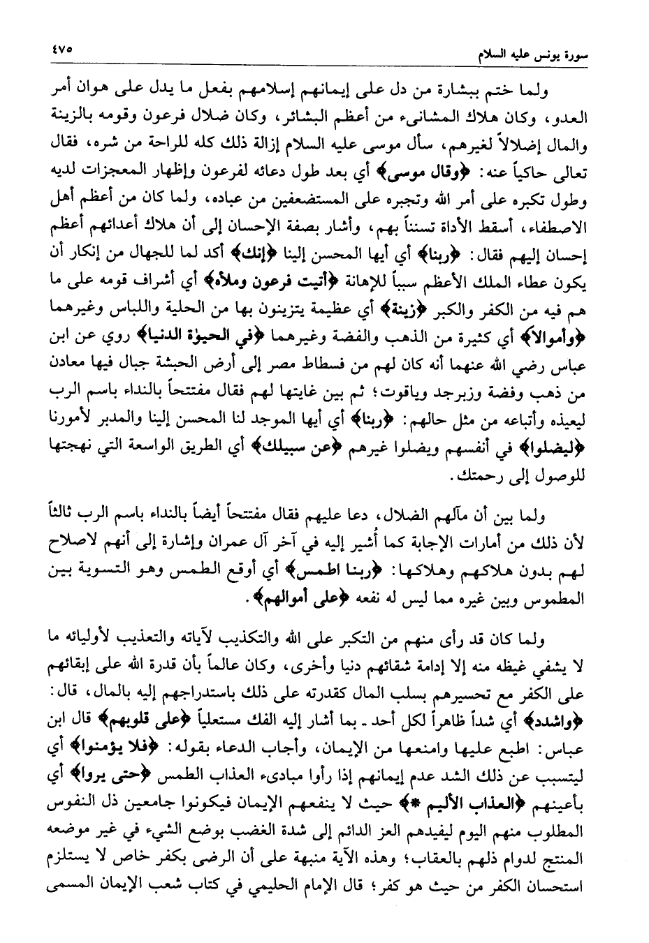 ولما كان قد رأى منهم من التكبر على الله والتكذيب لآيانه والتعذيب لأوليائه ما لا يشفي غيظه منه إلا إدامة شقائهم دنيا وأخرى ، وكان عالماً بأن قدرة الله على إبقائهم على الكفر مع تحسيرهم بسلب المال كقدرته على ذلك باستدراجهم إليه بالمال ، قال : ( واشدد ( اي شداً ظاهراً لكل أحد - بما اشار إليه الفك مستعلياً ) على قلوبهم ( قال ابن عباس : اطبع عليها وامنعها من الإيمان ، وأجاب الدعاء بقوله : ( فلا يؤمنوا ) أي ليتسبب عنذلك الشد عدم إيمانهم إذا رأوا مبادىء العذاب الطمس ) حتى يروا ( اي بأعينهم ) العذاب الأليم ( حيث لا ينفعهم إذا الإيمان فيكونوا جامعين ذل النفوس المطلوب منهم اليوم ليفيدهم العز الدائم إلى شدة الغضب بوضع الشيء في غير موضعه المنتج لدواتم ذلهم بالعقاب ؛ وهذه الآية منبه على أن الرضى بكفر خاص لا يستلزم استحسان الكفر من حيث هو كفر ؛ قال الإمام الحليمي في كتاب شعب الإيمان المسمى