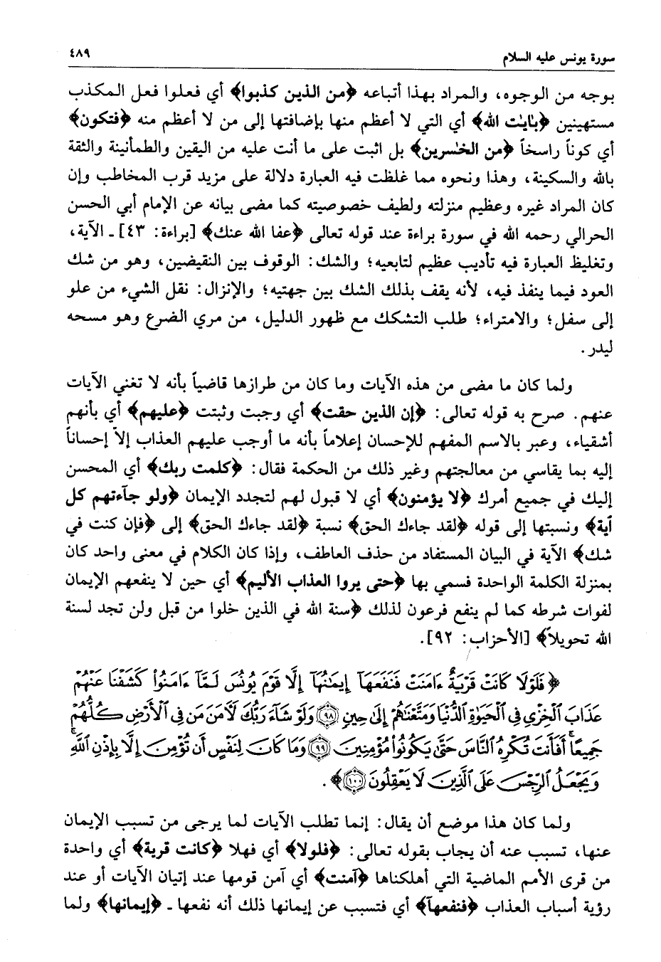 ) فَلَوْلاَ كَانَتْ قَرْيَةٌ آمَنَتْ فَنَفَعَهَآ إِيمَانُهَا إِلاَّ قَوْمَ يُونُسَ لَمَّآ آمَنُواْ كَشَفْنَا عَنْهُمْ عَذَابَ الخِزْيِ فِي الْحَيَاةَ الدُّنْيَا وَمَتَّعْنَاهُمْ إِلَى حِينٍ وَلَوْ شَآءَ رَبُّكَ لآمَنَ مَن فِي الأَرْضِ كُلُّهُمْ جَمِيعاً أَفَأَنتَ تُكْرِهُ النَّاسَ حَتَّى يَكُونُواْ مُؤْمِنِينَ وَمَا كَانَ لِنَفْسٍ أَن تُؤْمِنَ إِلاَّ بِإِذْنِ اللَّهِ وَيَجْعَلُ الرِّجْسَ عَلَى الَّذِينَ لاَ يَعْقِلُونَ ( ( )