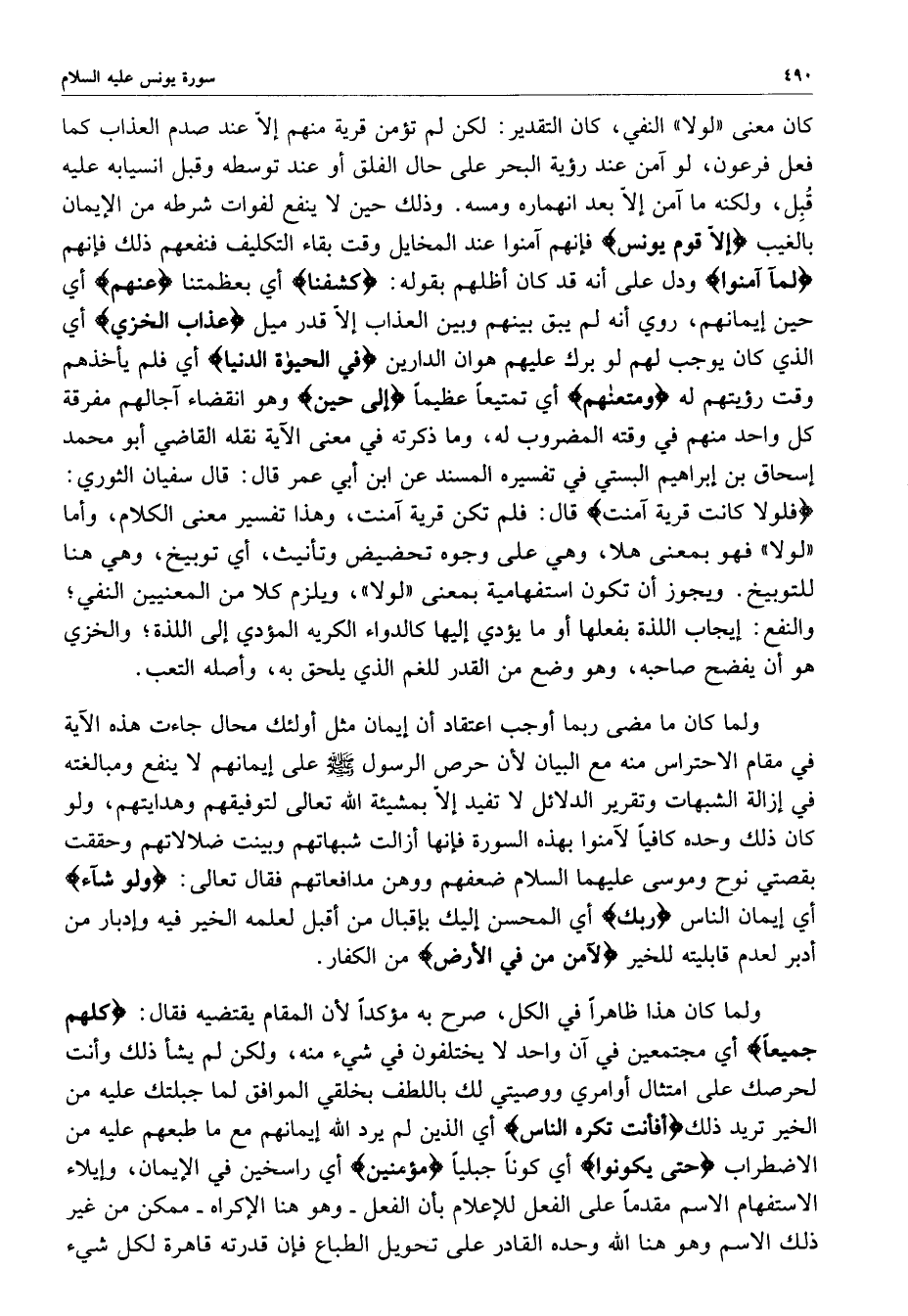ولما كن ما مضى ربما أوجب اعتقاد أن غيمان مثل أولئك محال هذه الآية في مقام الاحتراس منه مع البيان لأن حرض الرسول ( صلى الله عليه وسلم ) على غيمانهم لا ينفع ومبالغته في إزالة الشبهات وتقرير الدلائل لا تفيد إلاّ بمشيئة الله تعالى لتوفيقهم وهدايتهم ، ولو كان ذلك وحده كافياً لآمنوا بهذا السورة فإنها أزالت شبهاتهم وبينت ضلالاتهم وحققت بقصتي نوح وموسى عليهما السلام ضعفهم ووهن مدافعاتهم فقال تعالى : ( ولو شآء ) أي إيمان الناس ) ربك ( أيالمحسن غليك بإقبال من اقبل لعلمه الخير فيه وإدبار من أدبر لعدم قابليته لخير ) لآمن من في الأرض ( من الكفار .