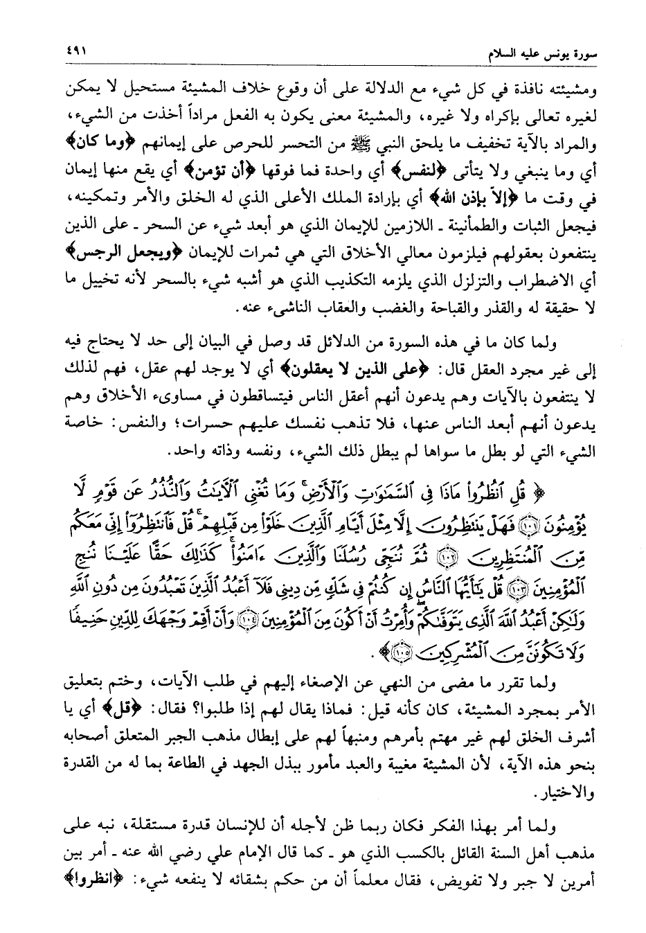) قُلِ انظُرُواْ مَاذَا فِي السَّمَاوَاتِ وَالأَرْضِ وَمَا تُغْنِي الآيَاتُ وَالنُّذُرُ عَن قَوْمٍ لاَّ يُؤْمِنُونَ فَهَلْ يَنتَظِرُونَ إِلاَّ مِثْلَ أَيَّامِ الَّذِينَ خَلَوْاْ مِن قَبْلِهِمْ قُلْ فَانْتَظِرُواْ إِنَّي مَعَكُمْ مِّنَ الْمُنْتَظِرِينَ ثُمَّ نُنَجِّي رُسُلَنَا وَالَّذِينَ آمَنُواْ كَذَلِكَ حَقّاً عَلَيْنَا نُنجِ الْمُؤْمِنِينَ قُلْ يأَيُّهَا النَّاسُ إِن كُنتُمْ فِي شَكٍّ مِّن دِينِي فَلاَ أَعْبُدُ الَّذِينَ تَعْبُدُونَ مِن دُونِ اللَّهِ وَلَكِنْ أَعْبُدُ اللَّهَ الَّذِي يَتَوَفَّاكُمْ وَأُمِرْتُ أَنْ أَكُونَ مِنَ الْمُؤْمِنِينَ وَأَنْ أَقِمْ وَجْهَكَ لِلدِّينِ حَنِيفاً وَلاَ تَكُونَنَّ مِنَ الْمُشْرِكِينَ ( ( )