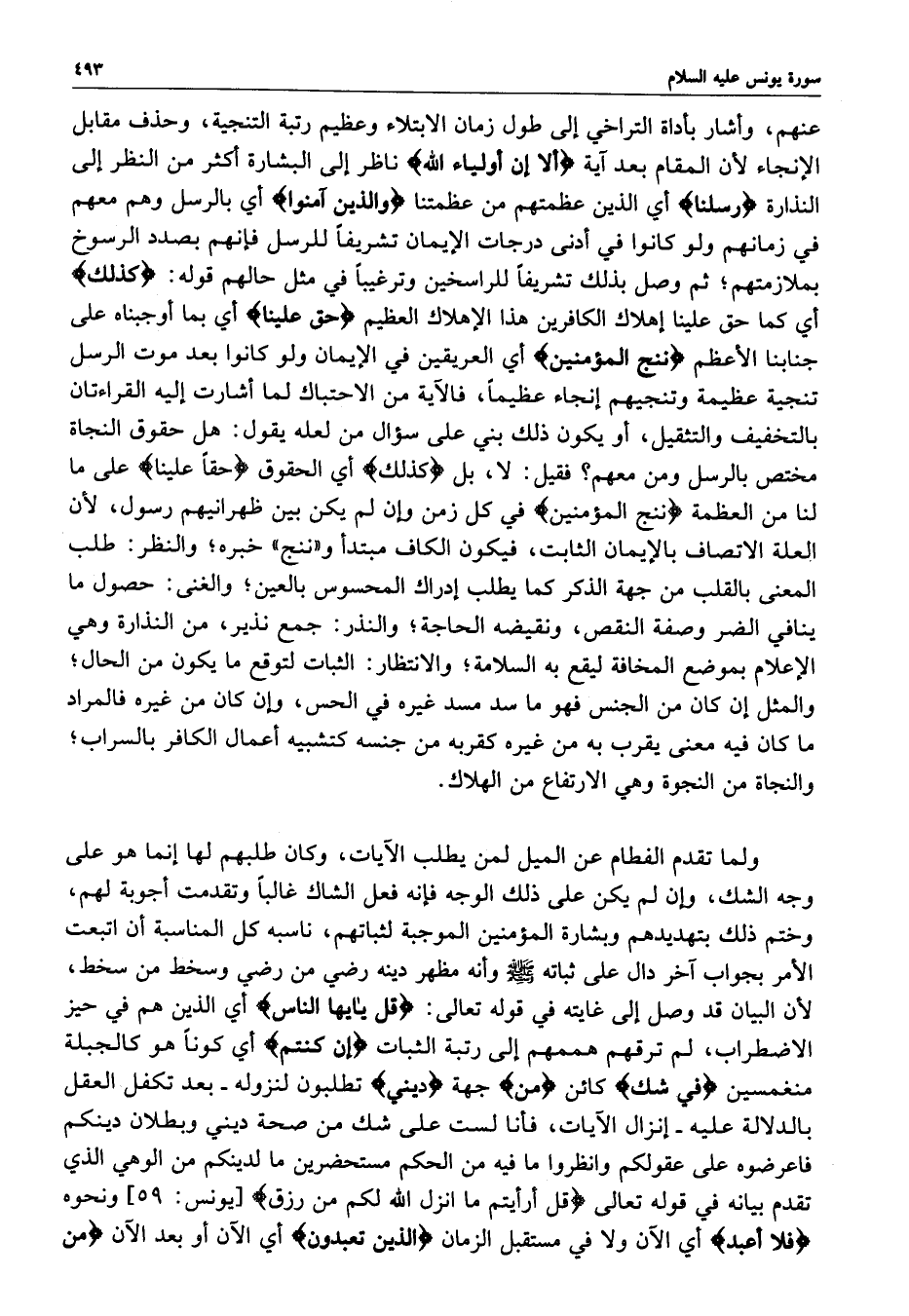 عنهم ، وأشار بأداة التراخي إلى طول زمان الابتلاء وعظيم رتبة التنجية ، وحذف مقابل الإنجاء لأن المقام بعد آية ) ألا إن أولياء الله ( ناظر غلى البشارة أكثر من النظر غلى النذارة ) رسلنا ) أي الذين عظمتهم من عظمتنا ) والذبن آمنوا ( اي بالرسل وهم معهم في زمانهم ولو كانوا في أدنى درجات الإيمان تشريفاً للراسخين وترغيباً في مثل حالهم قوله : ( كذلك ( اي كما حق علينا إهلاك الكافرين هذا الإهلاك العظيم ) حق علينا ) أي بما أوجبناه على جنابنا الأعظم ) ننج المؤمنين ) أي العريقين في الإيمان وو كاوا بعد موت الرسل تنجية عظيمة وتنجيهم إنجاء عظيماً ، فالآية من الاحتباك لما أشارت إليه القراءتان بالتخفيف والتثقيل ، أو يكون ذلك بني على سؤال من لعله يقول : هل حقوق النجاة مختص بالرسل ومن معهم ؟ فقيل : لا ، بل ) كذلك ) أي الحقوق ) حقاً علينا ( على ما لنا من العظمة ) ننج المؤمنين ( في كل وزمن وإن لم يكن بين ظهرانيهم رسول ، لأن العلة الاتصاف بالإيمان الثابت ، فيكون الكاف مبتدأ ( وننج ) خبره ؛ والنظر : طلب المعنى بالقلب من جهة الذكر كما يطلب إدراك المحسوس بالعين ؛ والغنى : حصول ما ينافي الضر وصفة النقص ، ونقيضه الحاجة ؛ والنذر : جمع نذير ، من النذارة وهي الإعلام بموضع المخافة ليقع به السلامة ؛ والانظار : الثبات لتوقع ما يكون من الحال ؛ والمثل إن كان من الجنس فهو ما سد مسد غيره من الحس ، وإن كن من غيره فالمراد ما كان فيه معنى يقرب به من غير كقربه منجنسه كتشبيه أعمال الكافر بالسراب ؛ والنجاة من النجوة وهي الارتفاع من الهلاك .