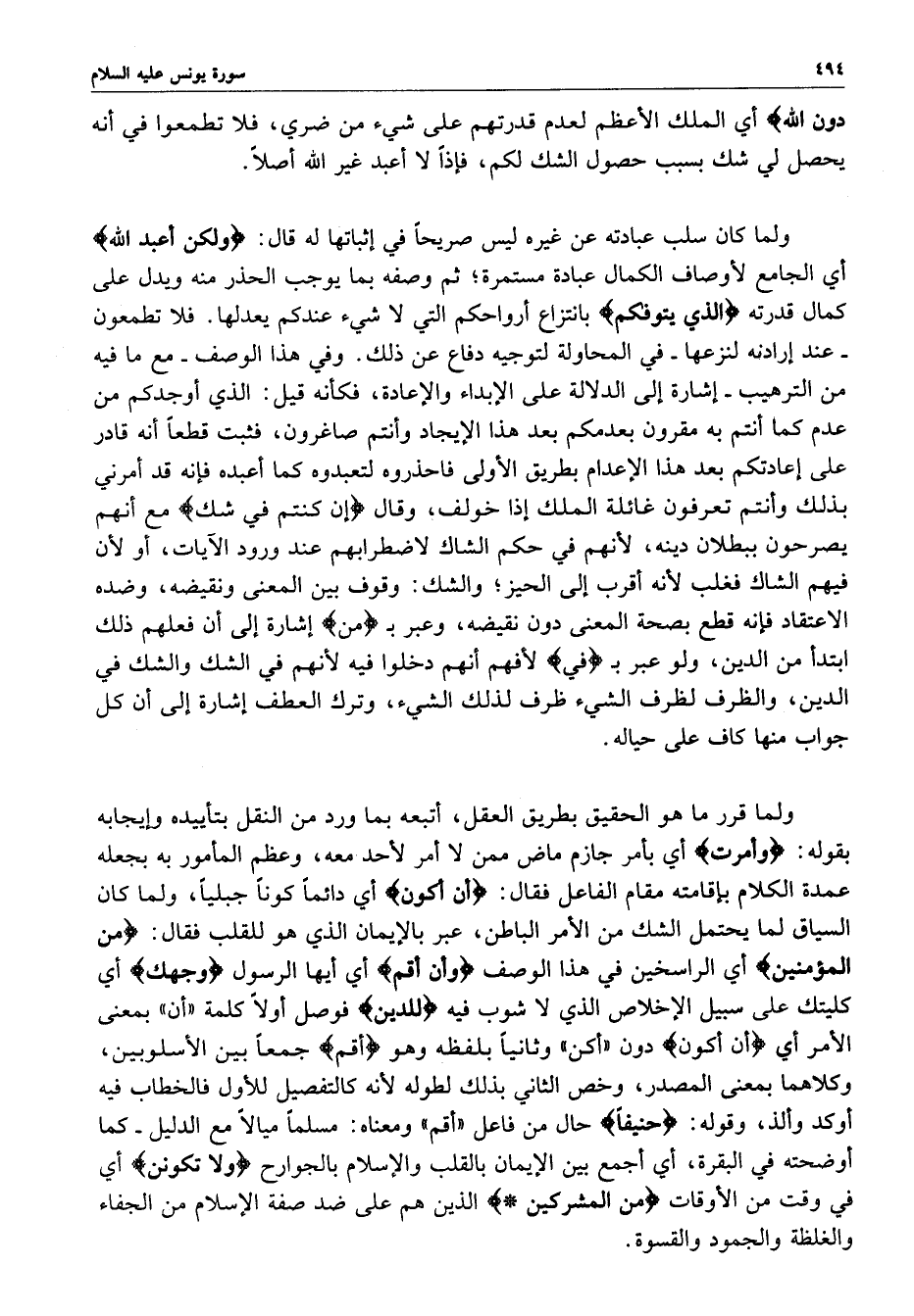 ولما قرر ما هو الحقيق بطريق العقل ، اتبعه بما رود من النقل بتأييده وإيجابه بقوله : ( وأمرت ) أي بأمر جازم ماض ممن لا أمر لأحد معه ، وعظم المأمور به بجعله عمدة الكلام بإقامته مقام الفاعل فقال : ( أن أكون ) أي دائماً كوناً جبلياً ، ولما كان السياق لما يحتمل الشك من امر الباطن ، عبر بالإيمان الذي هو للقلب فقال : ( من المؤمنين ) أي الراسخين في هذا الوصف ) وأن اقم ( اي أيها الرسول ) وجهك ) أي كليتك على سبيل الإخلاص الذي لا شوب فيه ) للدين ( فوصل أولاً كلمه ( أن ) بمعنى الأمر أي ) أن أكون ( دون ( أكن ) وثانياً بلفظه وهو ) أقم ( جمعاً بين الأسلوبين ، وكلاهما بمعنى المصدر ، وخص الثاني بذلك لطوله لأنه كالتفصيل للأول فالخطاب فيه أوكد وألذ ، وقوله : ( حنيفاً ( حال من فاعل ( أقم ) ومعناه : مسلياً ميالاً مع الدليل - كما اوضحته في البقرة ، اي أجمع بين الإيمان بالقلب والإسلام بالجوارح ) ولا تكونن ) أي في وقت من الأوقات ) من المشركين ( الذين هم على ضد صفة الإسلام من الجفاء والغلظة والجمود والقسوة .